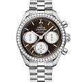 Speedmaster 38 мм переосмысливает культовый хронограф OMEGA, сохраняя его особенности в изысканном компактном формате. Полированный корпус из нержавеющей стали сияет в обрамлении безеляБезельВнешний ободок, закрепляющий стекло. В спортивных часах так называется поворотное кольцо с делениями на циферблате, выполняет роль таймера – замеряет отрезки времени на шкале. Неподвижный безель – элемент декора. Однонаправленно вращающийся безель на дайверских часах позволяет фиксировать моменты погружения и выныривания на поверхность. с 52 бриллиантами, а заводную головку венчает еще один сверкающий камень. Коричневый циферблат с PVD-покрытиемPVDУльтратонкое покрытие наносится в технике вакуумного напыления, сочетает в себе нитрид титана особой прочности со слоем золота или оксида хрома. Несёт в себе декоративную или защитную функцию. играет переливами, демонстрируя горизонтальные овальные счетчики с серебристым покрытием и вертикальное окошко даты на 6 часах. Стрелки с алмазной полировкойЛюминесцентное покрытиеПозволяет считывать показания времени в темноте. Производители наносят на стрелки, часовые индексы, безель или поверхность циферблата светонакопительный состав, дающий холодное свечение., покрытые Super-LumiNova, мерцают изумрудным светом в темноте. Браслет из нержавеющей стали с чередующейся полировкой и матовыми поверхностями оснащен фирменной системой регулировки OMEGA. На завинчивающейся задней крышке красуется медальон с морским коньком, а сердцем модели служит точный калибр OMEGA Co-Axial 3330 - современная интерпретация легендарного механизма.