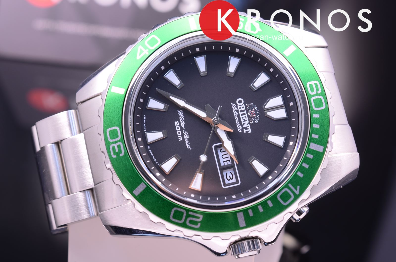 Чёрный циферблат с зелёным безелемБезельВнешний ободок, закрепляющий стекло. В спортивных часах так называется поворотное кольцо с делениями на циферблате, выполняет роль таймера – замеряет отрезки времени на шкале. Неподвижный безель – элемент декора. Однонаправленно вращающийся безель на дайверских часах позволяет фиксировать моменты погружения и выныривания на поверхность. не имеет лишних деталей. Японский автоматический калибр Orient 46943 имеет запас хода на 40 часов. Завинчивающаяся задняя крышка и заводная головка усиливают водостойкость в 200 метров. люминесцентная подсветкаЛюминесцентное покрытиеПозволяет считывать показания времени в темноте. Производители наносят на стрелки, часовые индексы, безель или поверхность циферблата светонакопительный состав, дающий холодное свечение. позволяет просматривать время и в темноте. На позиции 3 часов – окошко даты и дня недели.