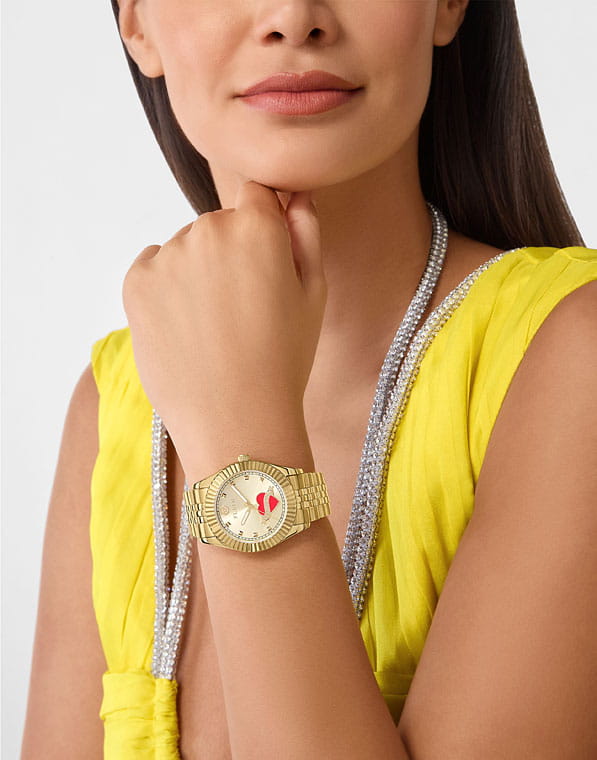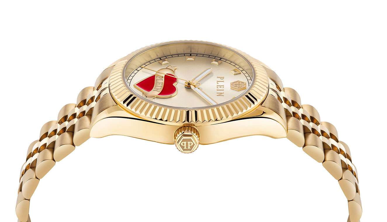 Женские кварцевые часы Philipp Plein Plein Valentine PW2BA0725 – дерзкое заявление любви к роскоши и бунтарскому стилю. Диаметр круглого корпуса из прочной нержавеющей стали с PVD-покрытиемPVDУльтратонкое покрытие наносится в технике вакуумного напыления, сочетает в себе нитрид титана особой прочности со слоем золота или оксида хрома. Несёт в себе декоративную или защитную функцию. равен 38 мм. Минеральное стеклоМинеральное стеклоМинеральное стекло представляет собой искусственно выращенный минерал кварца. Такое стекло отличается особой устойчивостью к повреждениям и царапинам. Уступает по некоторым качествам сапфировому стеклу. защищает циферблат от царапин. Стальной браслет на застёжке «бабочка» с кнопкамиЗастёжка "бабочка"Такой вид застёжки дополняется предохранителями, помогающими избежать случайного раскрытия браслета. Обладают изящным исполнением. обеспечивает надёжную фиксацию и комфортное ношение. Люминесцентное покрытиеЛюминесцентное покрытиеПозволяет считывать показания времени в темноте. Производители наносят на стрелки, часовые индексы, безель или поверхность циферблата светонакопительный состав, дающий холодное свечение. стрелок и меток позволит следить за временем даже в полной темноте. Яркий дизайн с узнаваемым логотипом Plein и смелыми акцентами не оставит вас незамеченным. Идеальный аксессуар для тех, кто ценит индивидуальность и не боится выделяться из толпы.