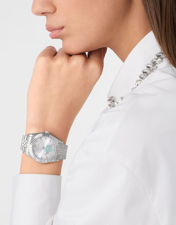 Женские кварцевые часы Philipp Plein Plein Valentine PW2BA1125 – дерзкое заявление любви к роскоши и бунтарскому стилю. Диаметр круглого корпуса из прочной нержавеющей стали с равен 38 мм. Минеральное стеклоМинеральное стеклоМинеральное стекло представляет собой искусственно выращенный минерал кварца. Такое стекло отличается особой устойчивостью к повреждениям и царапинам. Уступает по некоторым качествам сапфировому стеклу. защищает циферблат от царапин. Стальной браслет на застёжке «бабочка» с кнопкамиЗастёжка "бабочка"Такой вид застёжки дополняется предохранителями, помогающими избежать случайного раскрытия браслета. Обладают изящным исполнением. обеспечивает надёжную фиксацию и комфортное ношение. Люминесцентное покрытиеЛюминесцентное покрытиеПозволяет считывать показания времени в темноте. Производители наносят на стрелки, часовые индексы, безель или поверхность циферблата светонакопительный состав, дающий холодное свечение. стрелок и меток позволит следить за временем даже в полной темноте. Яркий дизайн с узнаваемым логотипом Plein и смелыми акцентами не оставит вас незамеченным. Идеальный аксессуар для тех, кто ценит индивидуальность и не боится выделяться из толпы.