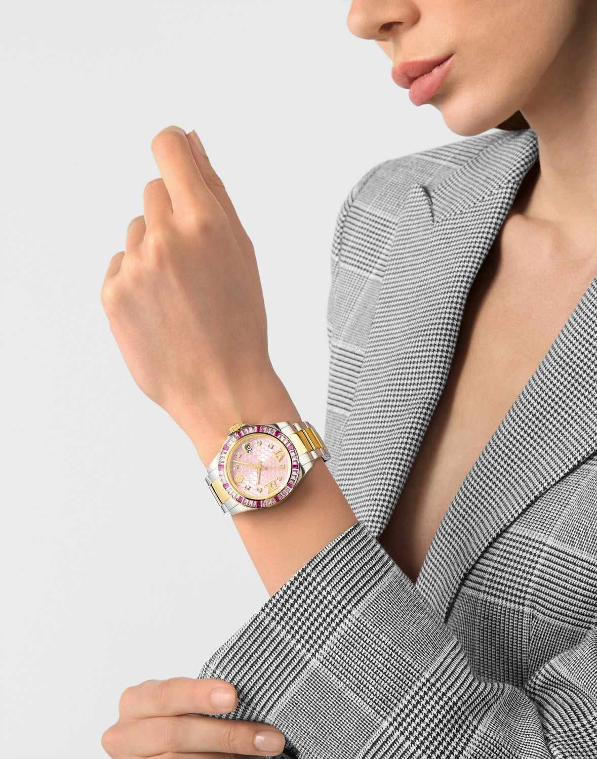 Женские кварцевые часы Philipp Plein Lady Empire PW2FA0325 — это стильное сочетание элегантности и современного дизайна. Изящный корпус выполнен из нержавеющей стали, диаметром 39 мм, что придаст образу женственности и романтизма. Изысканный циферблат с метками в виде точек и римских цифр придает модели особый блеск. Циферблат защищен минеральным стекломМинеральное стеклоМинеральное стекло представляет собой искусственно выращенный минерал кварца. Такое стекло отличается особой устойчивостью к повреждениям и царапинам. Уступает по некоторым качествам сапфировому стеклу., обеспечивающий устойчивость к царапинам и украшен кристаллами. Стрелки с люминесцентным покрытиемЛюминесцентное покрытиеПозволяет считывать показания времени в темноте. Производители наносят на стрелки, часовые индексы, безель или поверхность циферблата светонакопительный состав, дающий холодное свечение.. Окошко даты находится в положении 3 часа. БезельБезельВнешний ободок, закрепляющий стекло. В спортивных часах так называется поворотное кольцо с делениями на циферблате, выполняет роль таймера – замеряет отрезки времени на шкале. Неподвижный безель – элемент декора. Однонаправленно вращающийся безель на дайверских часах позволяет фиксировать моменты погружения и выныривания на поверхность. с PVD-покрытиемPVDУльтратонкое покрытие наносится в технике вакуумного напыления, сочетает в себе нитрид титана особой прочности со слоем золота или оксида хрома. Несёт в себе декоративную или защитную функцию. украшен цирконами. Часы оснащены надежным кварцевым механизмом. Стальной браслет с частичным PVD-покрытиемPVDУльтратонкое покрытие наносится в технике вакуумного напыления, сочетает в себе нитрид титана особой прочности со слоем золота или оксида хрома. Несёт в себе декоративную или защитную функцию. на застёжке-бабочке с кнопкамиЗастёжка "бабочка"Такой вид застёжки дополняется предохранителями, помогающими избежать случайного раскрытия браслета. Обладают изящным исполнением. , гарантирует комфортное и безопасное ношение. Класс водозащиты: 50 метров позволит защитить корпус от случайных брызг или капель дождя. Phlipp Plein — отличный выбор для тех, кто ценит яркость и качество.