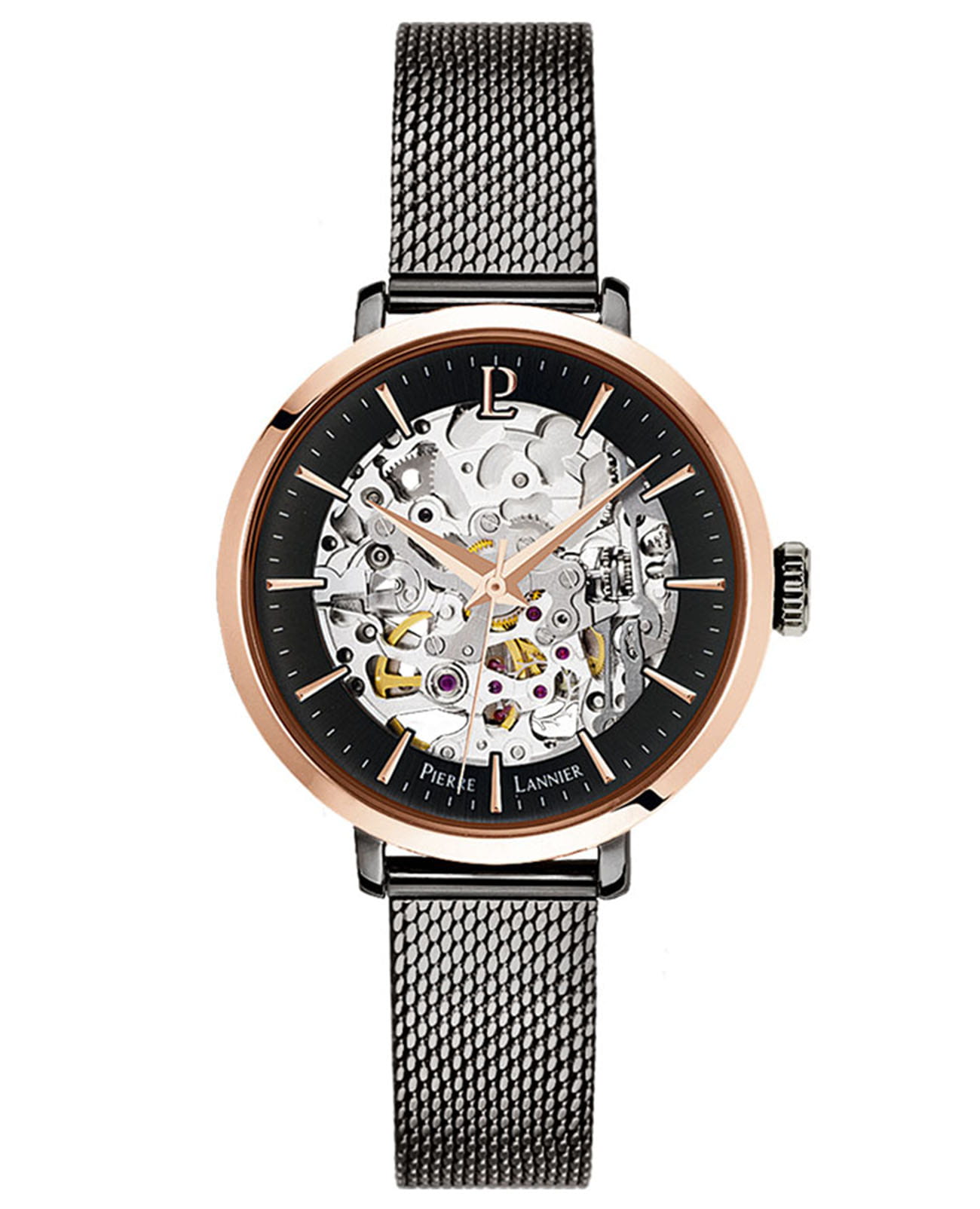 Женские механические часы с автоподзаводом Pierre Lannier Automatic 314C988 . Минеральное стеклоМинеральное стеклоМинеральное стекло представляет собой искусственно выращенный минерал кварца. Такое стекло отличается особой устойчивостью к повреждениям и царапинам. Уступает по некоторым качествам сапфировому стеклу. устойчивое к мелким механическим повреждениям. Скелетонизированный циферблат. Центральные часовая, минутная и секундная стрелки. Корпус и браслет выполнен из нержавеющей стали с IP-покрытиемIP-покрытиеМетод ионного напыления. Демонстрирует повышенную устойчивость к истиранию, окислению и химическим веществам. Под воздействием высокого давления и температуры около 1500°C молекулы металла надёжно соединяются с частицами корпуса часов.. Неподвижный безельБезельВнешний ободок, закрепляющий стекло. В спортивных часах так называется поворотное кольцо с делениями на циферблате, выполняет роль таймера – замеряет отрезки времени на шкале. Неподвижный безель – элемент декора. Однонаправленно вращающийся безель на дайверских часах позволяет фиксировать моменты погружения и выныривания на поверхность. из нержавеющей стали с IP-покрытиемIP-покрытиеМетод ионного напыления. Демонстрирует повышенную устойчивость к истиранию, окислению и химическим веществам. Под воздействием высокого давления и температуры около 1500°C молекулы металла надёжно соединяются с частицами корпуса часов. цвета розового золота. Водостойкость: 30 метров, позволит защитить корпус от случайных брызг или капель дождя. Стальной браслет миланского плетения с раскладной застёжкойРаскладная застёжкаТакой тип застёжки используется только на браслетах из металла. Она никогда не раскрывается полностью, происходит разделение на 2 и более частей. Раскладывающая застёжка снизит вероятность потери часов к минимуму..