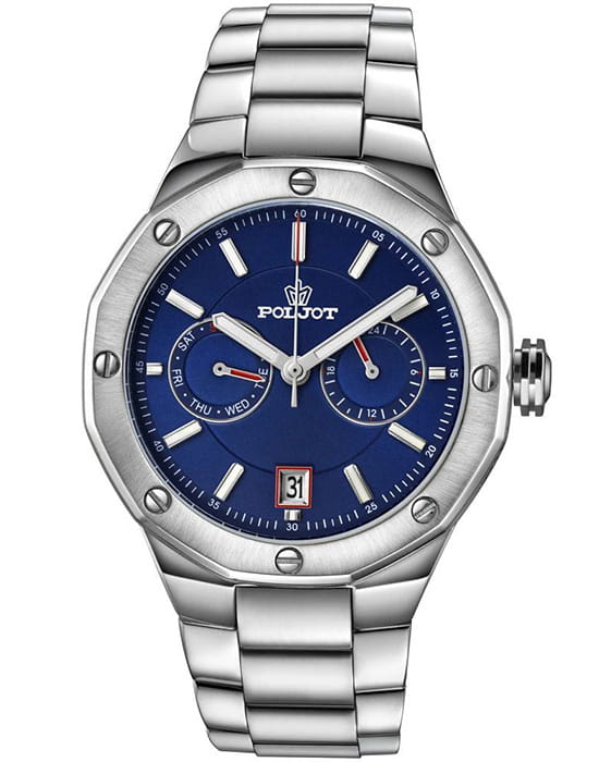 Poljot Ural JP21.361266Б — стильные кварцевые часы, сочетающие брутальный характер и современную элегантность. Корпус выполнен из нержавеющей стали, что придаёт модели монолитность и прочность, а глубокий циферблат подчеркивает премиальный облик. Стальной браслет на застёжке-бабочке с кнопкамиЗастёжка "бабочка"Такой вид застёжки дополняется предохранителями, помогающими избежать случайного раскрытия браслета. Обладают изящным исполнением. . Внутри установлен надёжный кварцевый механизм, обеспечивающий точный ход и плавную работу стрелок. Широкие метки и стрелки с люминесцентным покрытиемЛюминесцентное покрытиеПозволяет считывать показания времени в темноте. Производители наносят на стрелки, часовые индексы, безель или поверхность циферблата светонакопительный состав, дающий холодное свечение. гарантируют превосходную читаемость в любое время суток, а окно даты добавляет удобства. Прочное минеральное стеклоМинеральное стеклоМинеральное стекло представляет собой искусственно выращенный минерал кварца. Такое стекло отличается особой устойчивостью к повреждениям и царапинам. Уступает по некоторым качествам сапфировому стеклу. защищает циферблат от повреждений, а водонепроницаемость до 10 бар делает часы надёжным спутником как в деловом, так и активном образе жизни. Poljot Ural — воплощение силы, точности и мужского стиля, созданное для тех, кто ценит механику и уверенность в каждой детали.