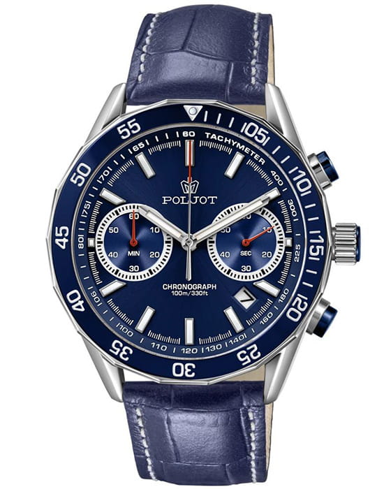 Poljot 6S21.181257 — яркие мужские часы с выразительным спортивным характером и акцентом на функциональность. Корпус из нержавеющей стали придаёт модели надёжность и солидность, а насыщенный циферблат с контрастными счётчиками хронографаХронографФункция позволяет измерять отрезки времени с особой точностью: часы, минуты, секунды. Верным признаком хронографа является наличие на циферблате 3 дополнительных окошек-счётчиков. создаёт динамичный и энергичный облик. БезельБезельВнешний ободок, закрепляющий стекло. В спортивных часах так называется поворотное кольцо с делениями на циферблате, выполняет роль таймера – замеряет отрезки времени на шкале. Неподвижный безель – элемент декора. Однонаправленно вращающийся безель на дайверских часах позволяет фиксировать моменты погружения и выныривания на поверхность. с PVD-покрытиемPVDУльтратонкое покрытие наносится в технике вакуумного напыления, сочетает в себе нитрид титана особой прочности со слоем золота или оксида хрома. Несёт в себе декоративную или защитную функцию.. Широкие стрелки и метки с люминесцентным покрытиемЛюминесцентное покрытиеПозволяет считывать показания времени в темноте. Производители наносят на стрелки, часовые индексы, безель или поверхность циферблата светонакопительный состав, дающий холодное свечение. обеспечивают отличную читаемость в любых условиях, а внешний обод с минутной шкалой подчёркивает спортивный стиль. Окно даты добавляет практичности. Прочное минеральное стеклоМинеральное стеклоМинеральное стекло представляет собой искусственно выращенный минерал кварца. Такое стекло отличается особой устойчивостью к повреждениям и царапинам. Уступает по некоторым качествам сапфировому стеклу. надёжно защищает циферблат от повреждений, а ремешок из натуральной кожи гармонично дополняет контрастную цветовую палитру. Poljot — это смелое сочетание спортивной энергии, точности и современного дизайна для активного и уверенного мужчины.