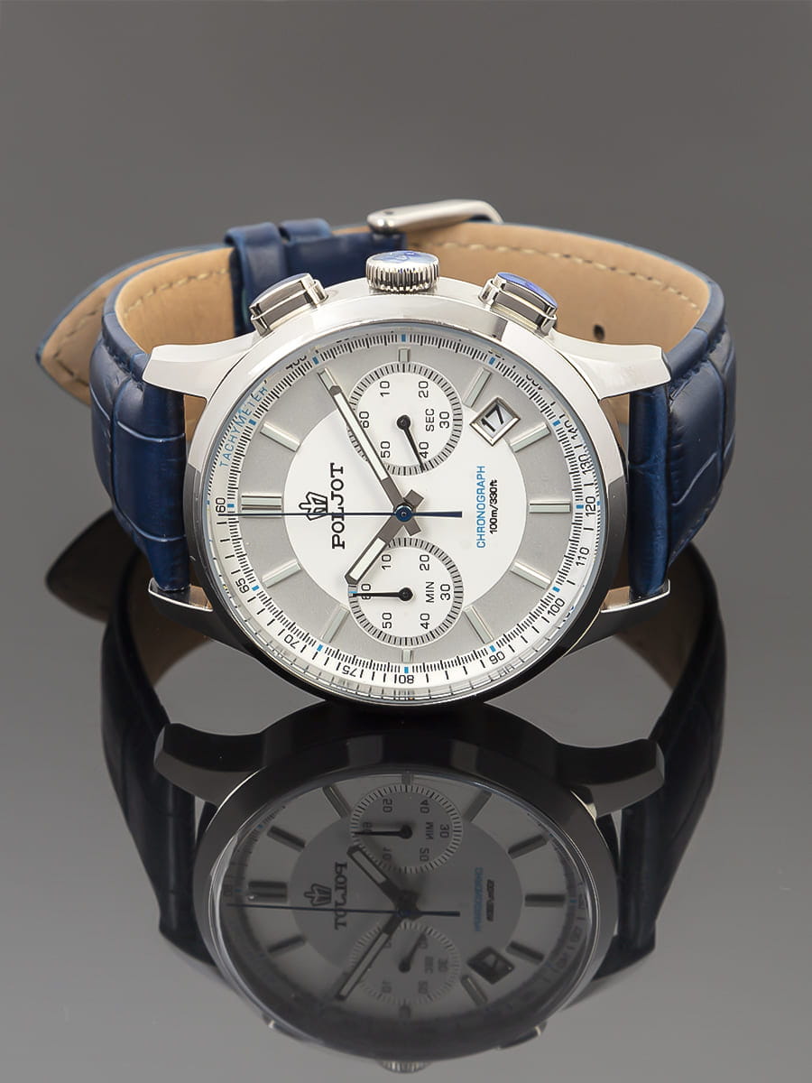 Poljot 6S21.901218 — современные мужские часы с выразительным спортивным дизайном и надёжной функциональностью. Корпус из нержавеющей стали подчёркивает прочность и уверенный характер модели, а глубокий циферблат с счётчиками хронографаХронографФункция позволяет измерять отрезки времени с особой точностью: часы, минуты, секунды. Верным признаком хронографа является наличие на циферблате 3 дополнительных окошек-счётчиков. и аккуратным окном даты придаёт часам динамичный вид. Контрастные стрелки и метки с люминесцентным покрытиемЛюминесцентное покрытиеПозволяет считывать показания времени в темноте. Производители наносят на стрелки, часовые индексы, безель или поверхность циферблата светонакопительный состав, дающий холодное свечение. обеспечивают удобство считывания информации в любое время суток, а внешняя шкала тахиметраТахиметрРазмеченная шкала, располагается на ободке или безеле часов. Тахиметр позволяет рассчитать скорость на определённом участке пути, расстояние измеряется в километрах или милях. добавляет спортивную функциональность. Прочное минеральное стеклоМинеральное стеклоМинеральное стекло представляет собой искусственно выращенный минерал кварца. Такое стекло отличается особой устойчивостью к повреждениям и царапинам. Уступает по некоторым качествам сапфировому стеклу. защищает циферблат от царапин, а ремешок из натуральной кожи гарантирует комфорт и элегантную посадку на запястье. Poljot — это гармония классики и спортивного духа, созданная для мужчин, ценящих точность, надёжность и уверенный стиль.
