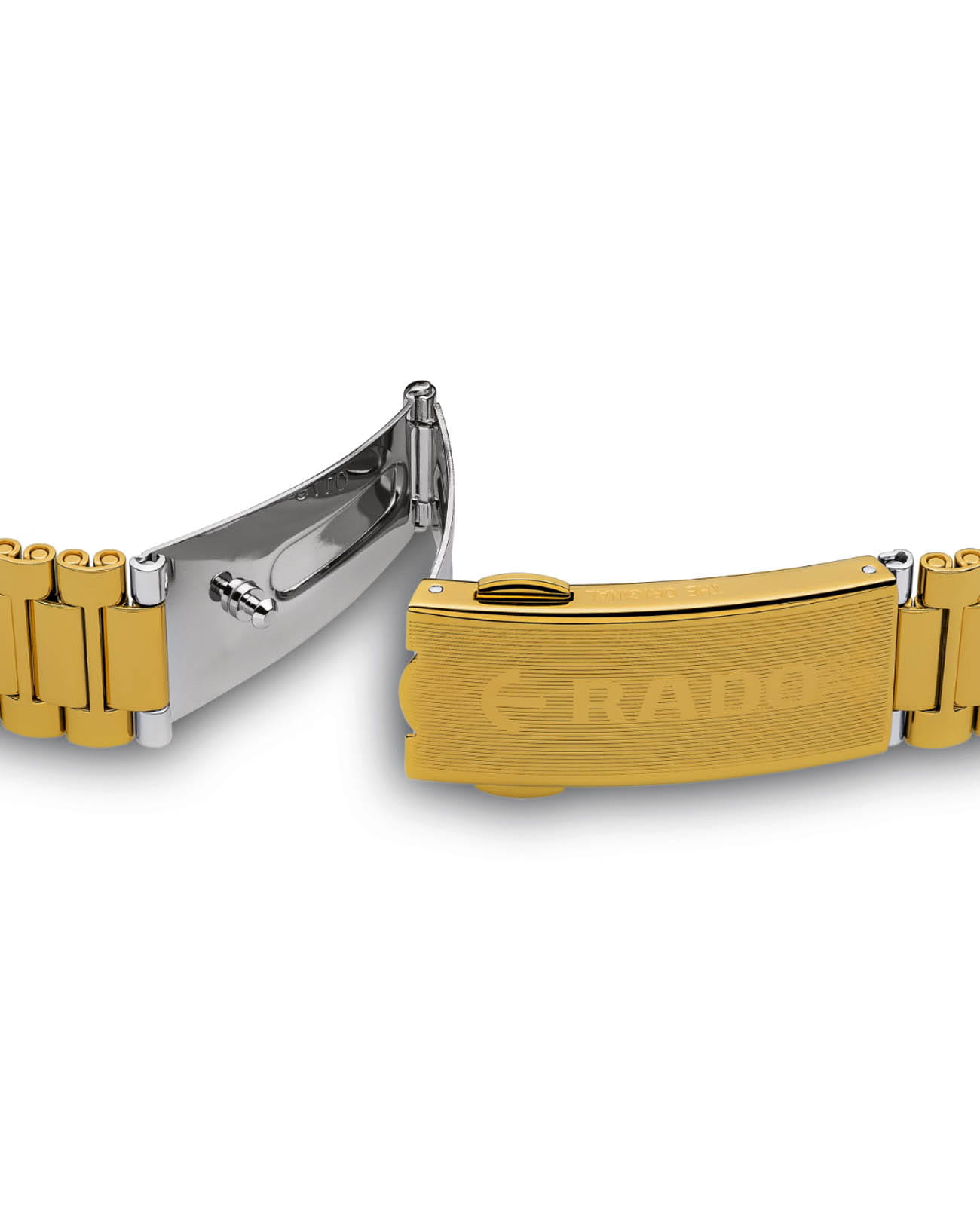 Женские часы Rado The Original Automatic R12416533 с надёжным автоматическим механизмом. Корпус и браслет часов выполнены из нержавеющей стали c PVD-покрытиемPVDУльтратонкое покрытие наносится в технике вакуумного напыления, сочетает в себе нитрид титана особой прочности со слоем золота или оксида хрома. Несёт в себе декоративную или защитную функцию.. Стальной браслет на раскладной застёжкеРаскладная застёжкаТакой тип застёжки используется только на браслетах из металла. Она никогда не раскрывается полностью, происходит разделение на 2 и более частей. Раскладывающая застёжка снизит вероятность потери часов к минимуму.. Класс водозащиты: 30 метров, позволит защитить корпус от случайных брызг или капель дождя. Окошко даты находится в положении 6 часов. Циферблат инкрустирован сапфирами. Стрелки и метки с люминесцентным покрытиемЛюминесцентное покрытиеПозволяет считывать показания времени в темноте. Производители наносят на стрелки, часовые индексы, безель или поверхность циферблата светонакопительный состав, дающий холодное свечение..
