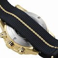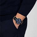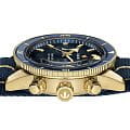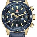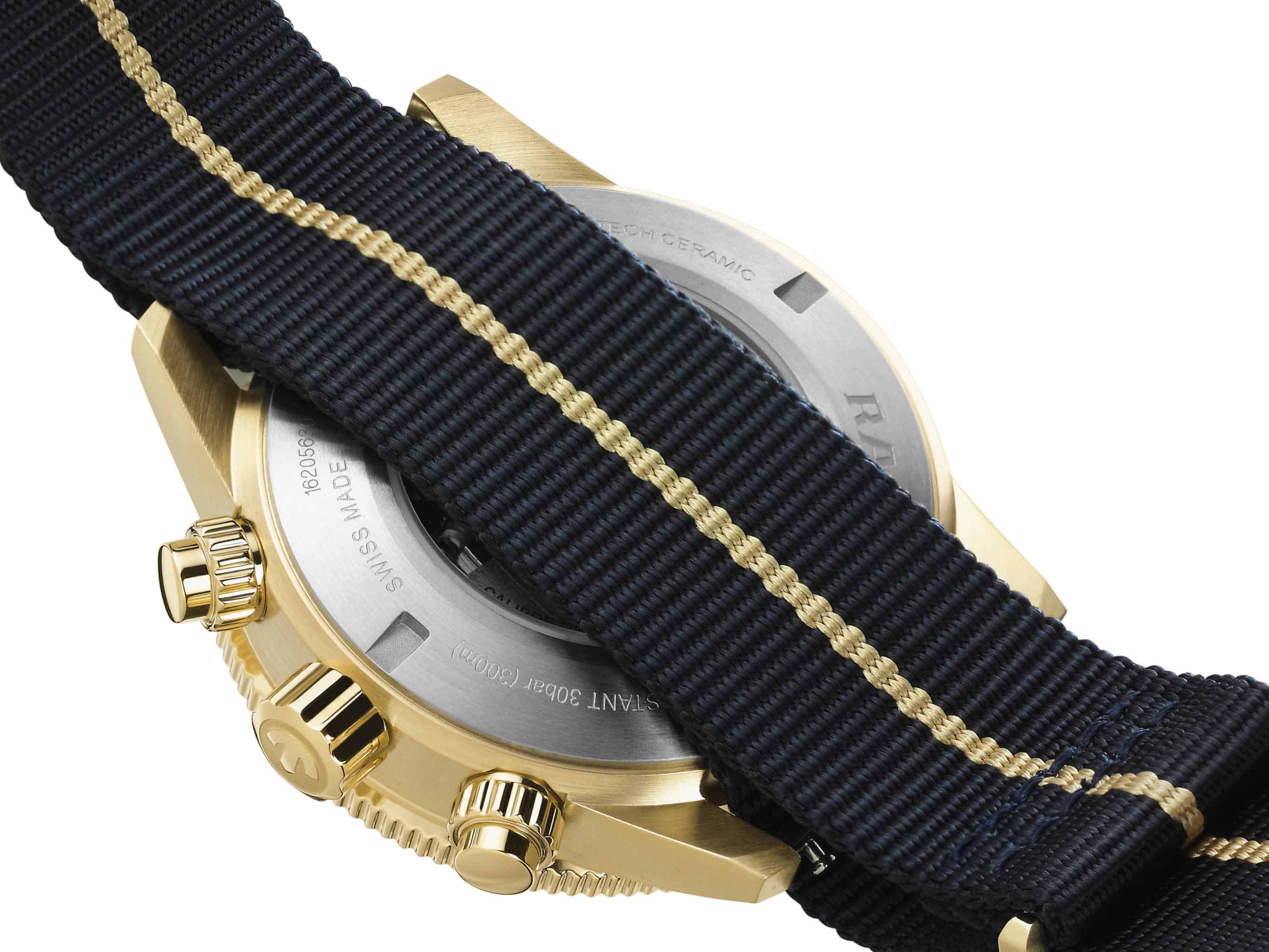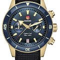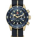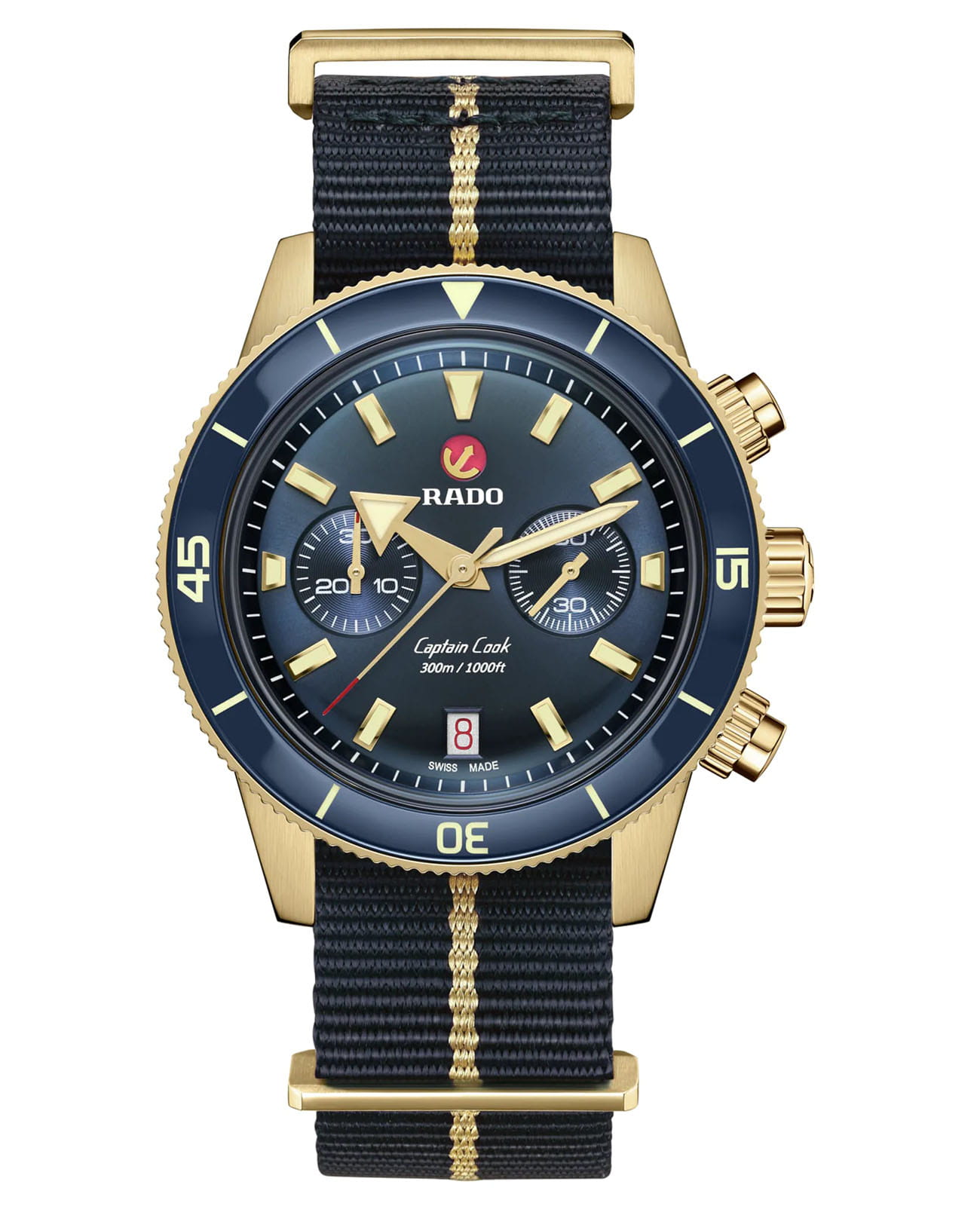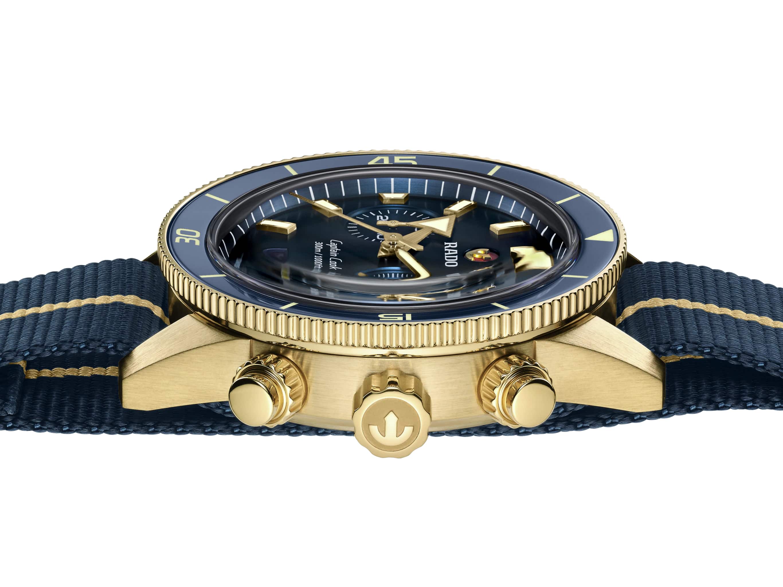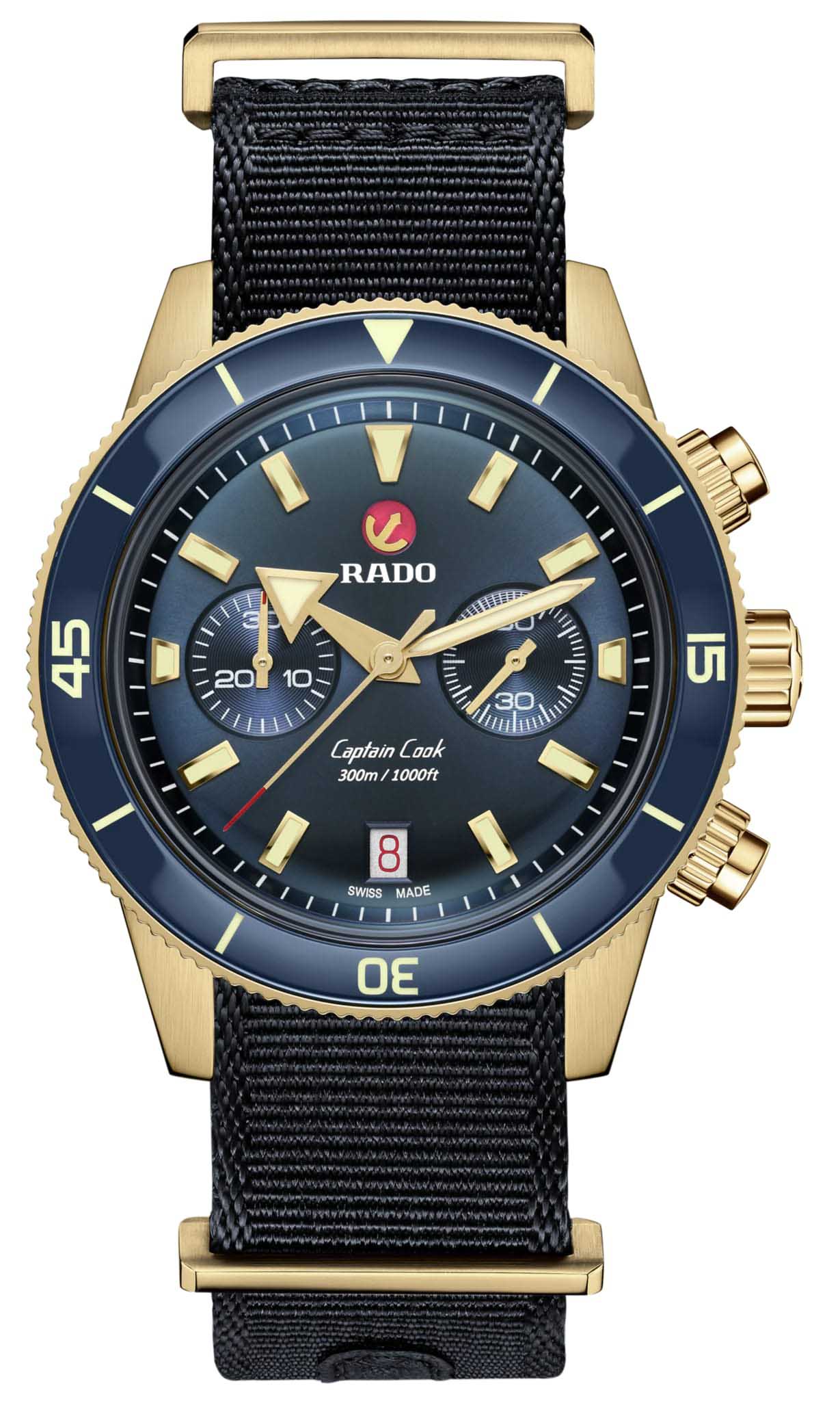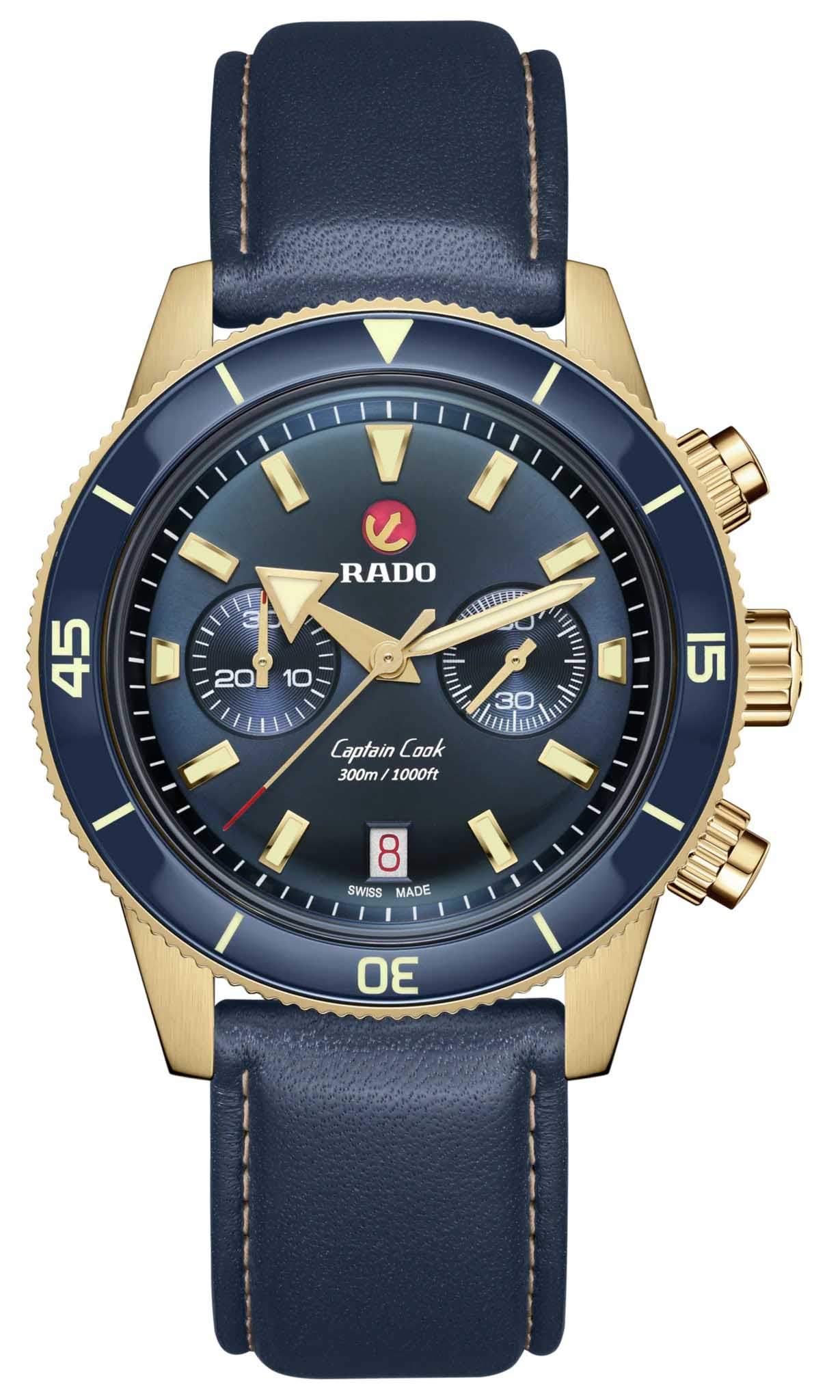 Хронограф Капитана Кука имеет характерное, устойчивое к царапинам Сапфировое стеклоСапфировое стеклоПрочный и надёжный материал из кристалла сапфира синтетического происхождения, характеризующийся особой твёрдостью и устойчивостью к царапинам и повреждениям. с антибликовым покрытием на обеих сторонах. Тонкий стильный корпус диаметром 43 мм из матовой бронзы имеет полированную синюю высокотехнологичную керамическую вставку на безелеБезельВнешний ободок, закрепляющий стекло. В спортивных часах так называется поворотное кольцо с делениями на циферблате, выполняет роль таймера – замеряет отрезки времени на шкале. Неподвижный безель – элемент декора. Однонаправленно вращающийся безель на дайверских часах позволяет фиксировать моменты погружения и выныривания на поверхность., дополняющую голубой циферблат Sunray. На цифры, маркеры и стрелочки нанесено люминесцентное покрытиеЛюминесцентное покрытиеПозволяет считывать показания времени в темноте. Производители наносят на стрелки, часовые индексы, безель или поверхность циферблата светонакопительный состав, дающий холодное свечение. Super-LumiNova®. Внутри новый, более тонкий автоматический механизм R801 с 37 камнями, пятью стрелками и 59 часами запаса хода благодаря антимагнитной пружине Nivachron™Nivachron™Специально разработанный инновационный сплав Nivachron™ повышает устойчивость часов к воздействию магнитных полей., превосходит стандартные требования к испытаниям с 3 до 5 положений для более высокой точности. Модель поставляется с тканевым ремешком с золотистой полосой по центру, а также синим кожаным ремешком и дополнительным тканевым ремешком темно-синего цвета.