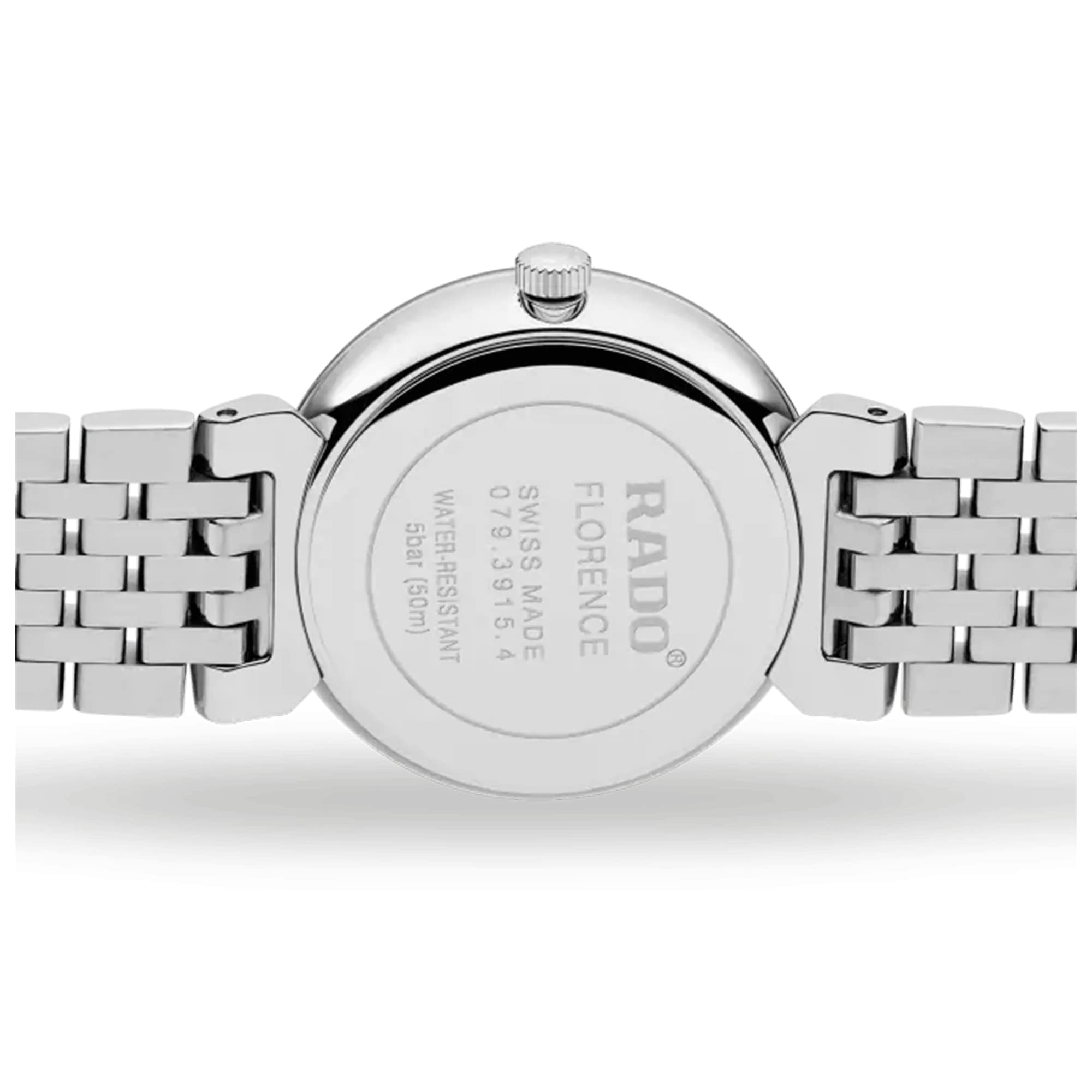 Гармоничный дизайн Rado Florence напоминает об элегантных силуэтах куполов и башенок города, чье название взято за основу названия этих часов. Благодаря качественному кварцевому часовому механизму и инновационному, полностью металлизированному сапфировому стеклу и неблекнущему сиянию бриллиантов, эти швейцарские часы с легкостью пройдут испытание временем. Стрелки с родиевым покрытием скользят по циферблату с бриллиантовыми делениями на 3, 6, 9 и 12 часов. Их сверкающее присутствие в новой коллекции Florence Classic подчеркивается возвращением логотипа Jubilé.