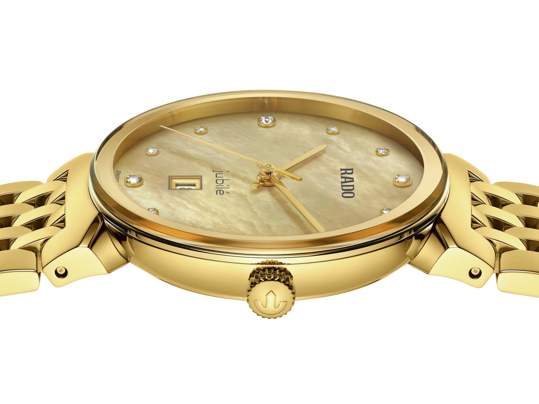 Швейцарские женские наручные часы с надёжным кварцевым механизмом Rado Florence Diamonds R48915903. Корпус и браслет часов изготовлены из нержавеющей стали с PVD-покрытиемPVDУльтратонкое покрытие наносится в технике вакуумного напыления, сочетает в себе нитрид титана особой прочности со слоем золота или оксида хрома. Несёт в себе декоративную или защитную функцию.. Сапфировое стеклоСапфировое стеклоПрочный и надёжный материал из кристалла сапфира синтетического происхождения, характеризующийся особой твёрдостью и устойчивостью к царапинам и повреждениям. с антибликовым покрытиемАнтибликовое покрытиеСлой оксида металла в 0,13-0,3 микрон, благодаря которому стекло часов не бликует и не отражает свет. Антибликовое покрытие уменьшает отражение света в 10 раз, обеспечивая отличную читаемость показателей циферблата., устойчивое к мелким механическим повреждениям. Стальной браслет на застёжке-бабочке с кнопкамиЗастёжка "бабочка"Такой вид застёжки дополняется предохранителями, помогающими избежать случайного раскрытия браслета. Обладают изящным исполнением. . Класс водозащиты: 50 метров, позволит защитить корпус от случайных брызг или капель дождя. Окошко даты находится в положении 6 часов.. Циферблат инкрустирован бриллиантами.