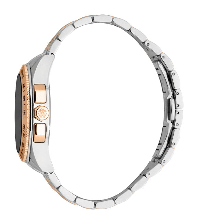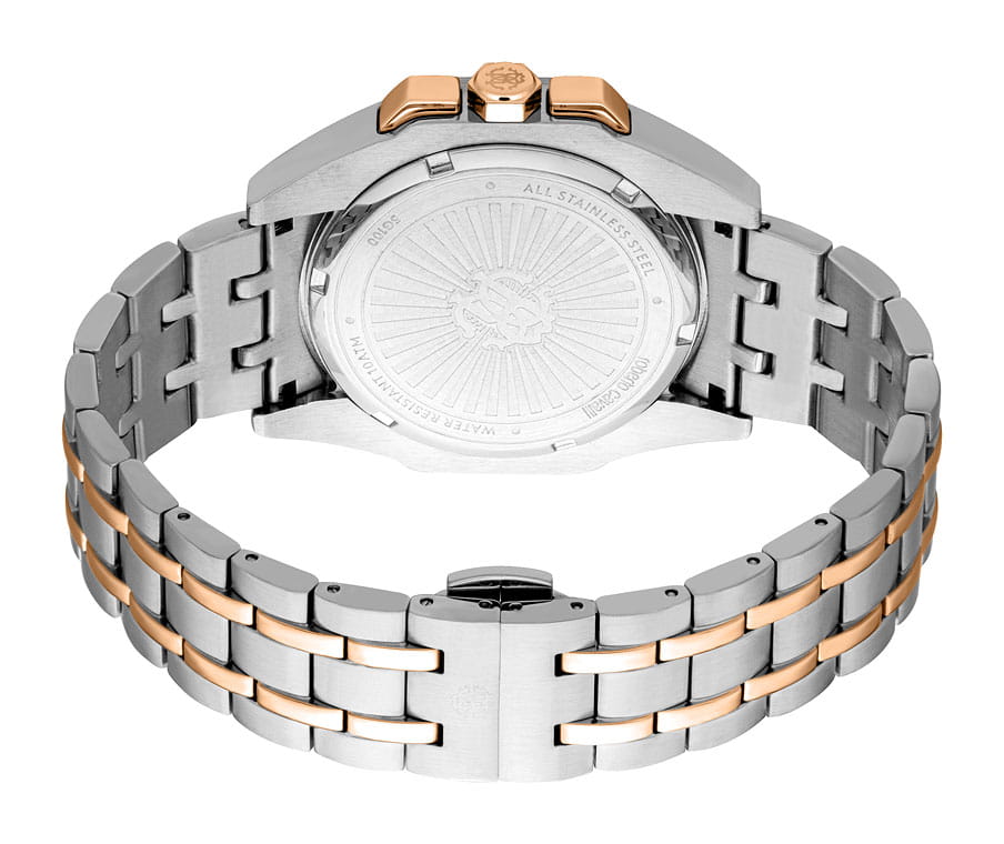 Погрузитесь в мир роскоши и безупречного стиля с мужскими наручными часами ROBERTO CAVALLI RC5G100M0085. Эти часы-хронографХронографФункция позволяет измерять отрезки времени с особой точностью: часы, минуты, секунды. Верным признаком хронографа является наличие на циферблате 3 дополнительных окошек-счётчиков. воплощение смелого дизайна и итальянской элегантности, созданные для мужчины, который ценит внимание к деталям и не боится заявить о себе. Круглый корпус диаметром 40 мм выполнен из нержавеющей стали, толщина корпуса составляет 12 мм, что придает модели выразительный внешний вид и надежную защиту от внешних воздействий. Циферблат, искусно оформленный фирменными элементами Roberto Cavalli, притягивает взгляд и подчеркивает ваш безупречный вкус. Часы оснащены кварцевым механизмом, обладают функцией отображения даты, а также тахиметромТахиметрРазмеченная шкала, располагается на ободке или безеле часов. Тахиметр позволяет рассчитать скорость на определённом участке пути, расстояние измеряется в километрах или милях., что делает их удобными для ежедневного использования. Минеральное стеклоМинеральное стеклоМинеральное стекло представляет собой искусственно выращенный минерал кварца. Такое стекло отличается особой устойчивостью к повреждениям и царапинам. Уступает по некоторым качествам сапфировому стеклу. защищает часы от царапин. Водозащита 100 метров, позволит плавать, нырять и заниматься другими водными видами спорта. Стальной браслет с частичным PVD-покрытиемPVDУльтратонкое покрытие наносится в технике вакуумного напыления, сочетает в себе нитрид титана особой прочности со слоем золота или оксида хрома. Несёт в себе декоративную или защитную функцию. на застёжке-бабочке с кнопкамиЗастёжка "бабочка"Такой вид застёжки дополняется предохранителями, помогающими избежать случайного раскрытия браслета. Обладают изящным исполнением. обеспечивает комфортное ношение. Неподвижный безельБезельВнешний ободок, закрепляющий стекло. В спортивных часах так называется поворотное кольцо с делениями на циферблате, выполняет роль таймера – замеряет отрезки времени на шкале. Неподвижный безель – элемент декора. Однонаправленно вращающийся безель на дайверских часах позволяет фиксировать моменты погружения и выныривания на поверхность. с PVD-покрытиемPVDУльтратонкое покрытие наносится в технике вакуумного напыления, сочетает в себе нитрид титана особой прочности со слоем золота или оксида хрома. Несёт в себе декоративную или защитную функцию.. Стрелки и метки с люминесцентным покрытиемЛюминесцентное покрытиеПозволяет считывать показания времени в темноте. Производители наносят на стрелки, часовые индексы, безель или поверхность циферблата светонакопительный состав, дающий холодное свечение. обеспечивают отличную читаемость в любое время суток.