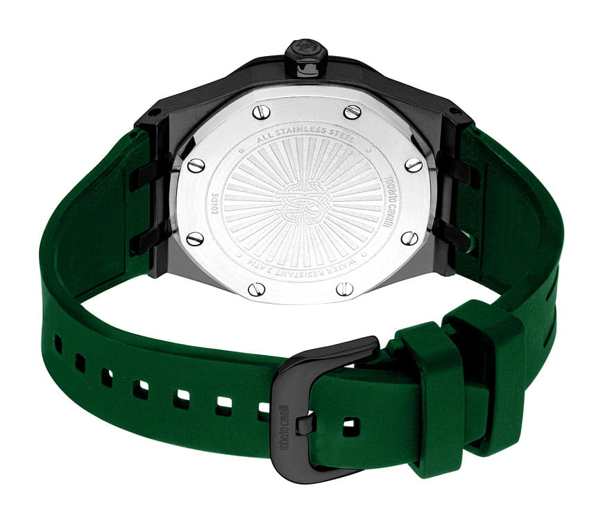 ROBERTO CAVALLI Uomo Ottagono RC5G102P0035 — стильные итальянские часы сочетающие в себе элегантность и современный функционал. Корпус диаметром 42 мм выполнен из нержавеющей стали с PVD-покрытиемPVDУльтратонкое покрытие наносится в технике вакуумного напыления, сочетает в себе нитрид титана особой прочности со слоем золота или оксида хрома. Несёт в себе декоративную или защитную функцию., толщина корпуса составляет 12 мм, что придает модели выразительный внешний вид и надежную защиту от внешних воздействий. Циферблат, искусно оформленный фирменными элементами Roberto Cavalli, притягивает взгляд и подчеркивает ваш безупречный вкус. Часы оснащены кварцевым механизмом, также обладают функцией отображения даты, что делает их удобными для ежедневного использования. Минеральное стеклоМинеральное стеклоМинеральное стекло представляет собой искусственно выращенный минерал кварца. Такое стекло отличается особой устойчивостью к повреждениям и царапинам. Уступает по некоторым качествам сапфировому стеклу. защищает часы от царапин. Водозащита 30 метров позволит защитить корпус от случайных брызг или капель дождя. Силиконовый ремешок на стандартной застёжке обеспечивает комфортное ношение. Стрелки и метки с люминесцентным покрытиемЛюминесцентное покрытиеПозволяет считывать показания времени в темноте. Производители наносят на стрелки, часовые индексы, безель или поверхность циферблата светонакопительный состав, дающий холодное свечение. обеспечивают отличную читаемость в любое время суток.