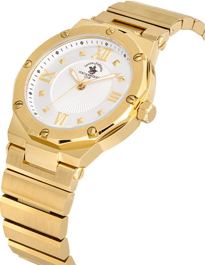 Женские кварцевые часы Santa Barbara Polo & Racquet Club — это стильный аксессуар, подчеркивающий индивидуальность. Корпус диаметром 36 мм выполнен из нержавеющей стали 316L с IP-покрытиемIP-покрытиеМетод ионного напыления. Демонстрирует повышенную устойчивость к истиранию, окислению и химическим веществам. Под воздействием высокого давления и температуры около 1500°C молекулы металла надёжно соединяются с частицами корпуса часов.. Циферблат серебристого цвета оформлен по технологии Sunray («солнечные лучи»), дополнен накладными метками в виде точек и римских цифр, а также фирменным логотипом. Стрелки заострённые, с люминесцентным покрытиемЛюминесцентное покрытиеПозволяет считывать показания времени в темноте. Производители наносят на стрелки, часовые индексы, безель или поверхность циферблата светонакопительный состав, дающий холодное свечение., обеспечивающим хорошую читаемость в темноте. Циферблат защищён минеральным стекломМинеральное стеклоМинеральное стекло представляет собой искусственно выращенный минерал кварца. Такое стекло отличается особой устойчивостью к повреждениям и царапинам. Уступает по некоторым качествам сапфировому стеклу.. Часы оснащены стальным браслетом с IP-покрытиемIP-покрытиеМетод ионного напыления. Демонстрирует повышенную устойчивость к истиранию, окислению и химическим веществам. Под воздействием высокого давления и температуры около 1500°C молекулы металла надёжно соединяются с частицами корпуса часов. и раскладной застёжкойРаскладная застёжкаТакой тип застёжки используется только на браслетах из металла. Она никогда не раскрывается полностью, происходит разделение на 2 и более частей. Раскладывающая застёжка снизит вероятность потери часов к минимуму.. Водонепроницаемость 30 м позволяет использовать часы в повседневных условиях. Идеальный выбор для тех, кто ценит элегантный дизайн и качество.