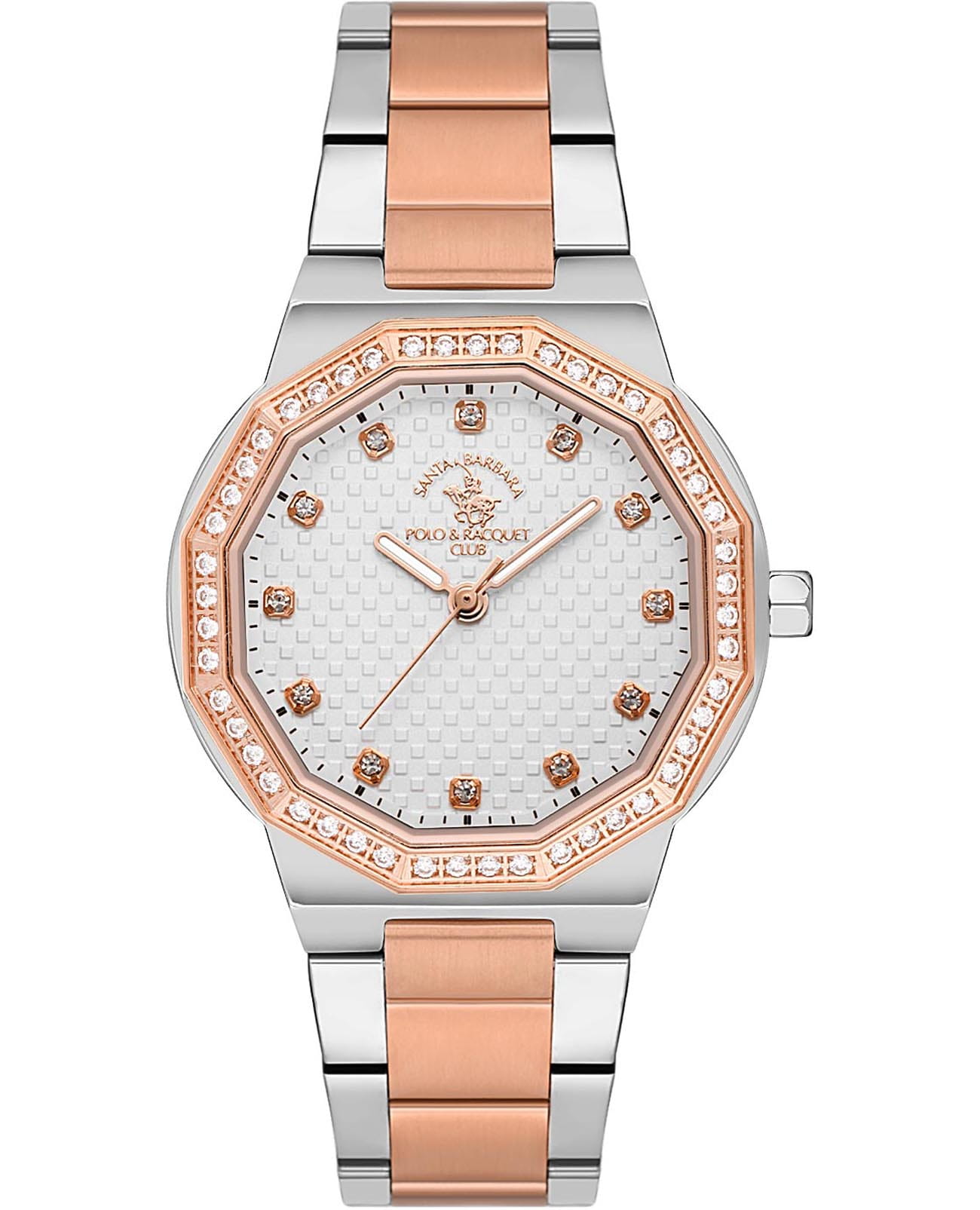 Женские кварцевые часы Santa Barbara Polo & Racquet Club Unique SB.1.10552-5 — это стильный аксессуар, подчеркивающий индивидуальность. Изысканный корпус диаметром 35 мм выполнен из нержавеющей стали 316L с 12-гранным безелемБезельВнешний ободок, закрепляющий стекло. В спортивных часах так называется поворотное кольцо с делениями на циферблате, выполняет роль таймера – замеряет отрезки времени на шкале. Неподвижный безель – элемент декора. Однонаправленно вращающийся безель на дайверских часах позволяет фиксировать моменты погружения и выныривания на поверхность. с IP-покрытиемIP-покрытиеМетод ионного напыления. Демонстрирует повышенную устойчивость к истиранию, окислению и химическим веществам. Под воздействием высокого давления и температуры около 1500°C молекулы металла надёжно соединяются с частицами корпуса часов., украшенным кристаллами. Изящный циферблат дополнен накладными метками в виде точек, украшенных кристаллами, а также фирменным логотипом. Стрелки скругленные с люминесцентным покрытиемЛюминесцентное покрытиеПозволяет считывать показания времени в темноте. Производители наносят на стрелки, часовые индексы, безель или поверхность циферблата светонакопительный состав, дающий холодное свечение., обеспечивающим хорошую читаемость в темноте. Циферблат защищён минеральным стекломМинеральное стеклоМинеральное стекло представляет собой искусственно выращенный минерал кварца. Такое стекло отличается особой устойчивостью к повреждениям и царапинам. Уступает по некоторым качествам сапфировому стеклу.. Часы оснащены надежным стальным браслетом с раскладной застёжкойРаскладная застёжкаТакой тип застёжки используется только на браслетах из металла. Она никогда не раскрывается полностью, происходит разделение на 2 и более частей. Раскладывающая застёжка снизит вероятность потери часов к минимуму. с частичным IP-покрытиемIP-покрытиеМетод ионного напыления. Демонстрирует повышенную устойчивость к истиранию, окислению и химическим веществам. Под воздействием высокого давления и температуры около 1500°C молекулы металла надёжно соединяются с частицами корпуса часов.. Водонепроницаемость 50 м позволяет использовать часы в повседневных условиях. Идеальный выбор для тех, кто ценит элегантный дизайн и качество.