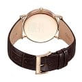 Стильная модель не имеет лишних деталей, лаконичный белый циферблат дополнен римскими цифрами и золотистыми стрелками. Секундный счётчик вынесен на отдельный круглый циферблат. Надёжный корпус защищает японский кварцевый механизм Seiko 6G28 от повреждений, он изготовлен из нержавеющей стали 316L с PVD-покрытиемPVDУльтратонкое покрытие наносится в технике вакуумного напыления, сочетает в себе нитрид титана особой прочности со слоем золота или оксида хрома. Несёт в себе декоративную или защитную функцию. цвета розового золота. Циферблат оснащён сапфировым стеклом, которое отличается устойчивостью к царапинам на 100%. Привлекательно смотрится ремешок из натуральной кожи. Класс водозащиты - WR 30, что обозначает устойчивость к водяным брызгам. Диаметр корпуса: 38 мм.