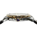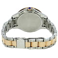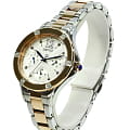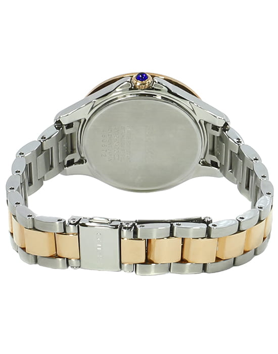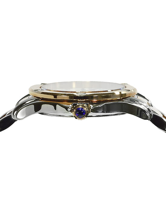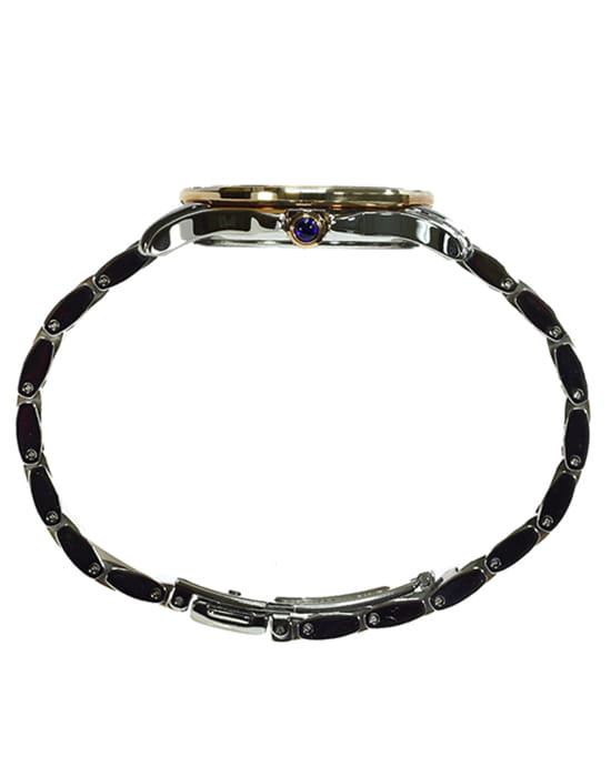 БезельБезельВнешний ободок, закрепляющий стекло. В спортивных часах так называется поворотное кольцо с делениями на циферблате, выполняет роль таймера – замеряет отрезки времени на шкале. Неподвижный безель – элемент декора. Однонаправленно вращающийся безель на дайверских часах позволяет фиксировать моменты погружения и выныривания на поверхность. наручных часов инкрустирован 6 кристаллами Swarovski. Японский кварцевый механизм 5Y19 защищён корпусом из стали 316L с цветным PVD-покрытиемPVDУльтратонкое покрытие наносится в технике вакуумного напыления, сочетает в себе нитрид титана особой прочности со слоем золота или оксида хрома. Несёт в себе декоративную или защитную функцию.. Индикация даты и дня недели вынесена на отдельные циферблаты. Минеральное стекло устойчиво к царапинам.