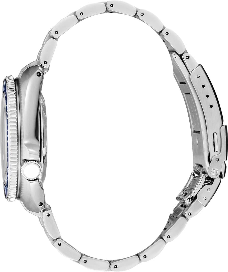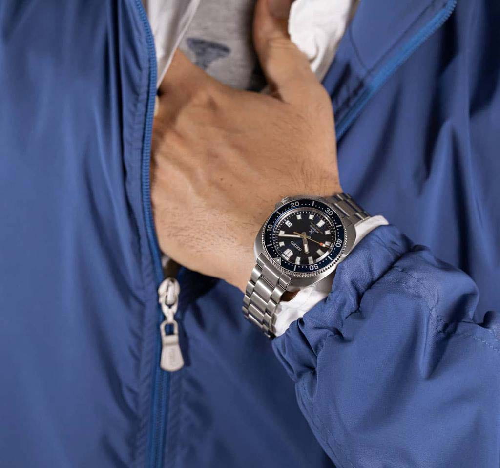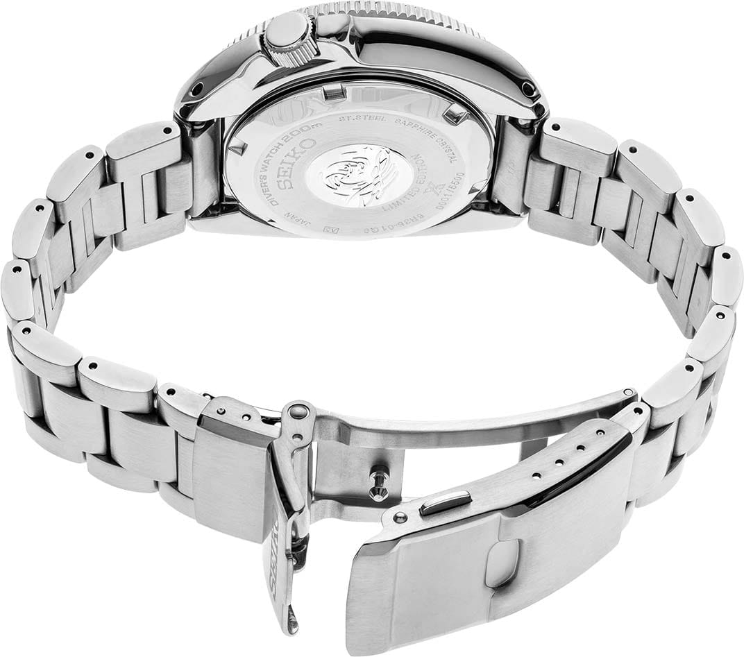 Мужские механические часы с автоподзаводом Seiko — это спортивный аксессуар из коллекции Prospex, выпущенный ограниченной серией в честь 55-летия легендарных дайверских часов Seiko — всего 5500 экземпляров. Корпус диаметром 42 мм и толщиной 13 мм выполнен из стали с частичным PVD-покрытиемPVDУльтратонкое покрытие наносится в технике вакуумного напыления, сочетает в себе нитрид титана особой прочности со слоем золота или оксида хрома. Несёт в себе декоративную или защитную функцию.. Циферблат синего цвета оформлен штрихами и логотипом бренда. Окошко даты расположено в положении 3 часов. Стрелки и метки с люминесцентным покрытиемЛюминесцентное покрытиеПозволяет считывать показания времени в темноте. Производители наносят на стрелки, часовые индексы, безель или поверхность циферблата светонакопительный состав, дающий холодное свечение. LumiBrite, обеспечивающим высокую читаемость в темноте. Циферблат защищён изогнутым сапфировым стекломСапфировое стеклоПрочный и надёжный материал из кристалла сапфира синтетического происхождения, характеризующийся особой твёрдостью и устойчивостью к царапинам и повреждениям. с антибликовым покрытиемАнтибликовое покрытиеСлой оксида металла в 0,13-0,3 микрон, благодаря которому стекло часов не бликует и не отражает свет. Антибликовое покрытие уменьшает отражение света в 10 раз, обеспечивая отличную читаемость показателей циферблата. на внутренней поверхности. Механизм — автоматический калибр 6R35 (24 камня, частота 21 600 полуколебаний в час) с возможностью ручного завода и функцией , запас хода до 70 часов. БезельБезельВнешний ободок, закрепляющий стекло. В спортивных часах так называется поворотное кольцо с делениями на циферблате, выполняет роль таймера – замеряет отрезки времени на шкале. Неподвижный безель – элемент декора. Однонаправленно вращающийся безель на дайверских часах позволяет фиксировать моменты погружения и выныривания на поверхность. — однонаправленный, вращающийся. Завинчивающаяся задняя крышка и заводная головка с защитой на позиции 4 часов повышают надёжность. Часы оснащены стальным браслетом с раскладной застёжкойРаскладная застёжкаТакой тип застёжки используется только на браслетах из металла. Она никогда не раскрывается полностью, происходит разделение на 2 и более частей. Раскладывающая застёжка снизит вероятность потери часов к минимуму. с системой блокировки. В комплекте — сменный силиконовый ремешок. Водонепроницаемость 200 м позволяет использовать часы для профессионального плавания и дайвинга. Идеальный выбор для тех, кто ценит историю, точность и мощный дизайн.