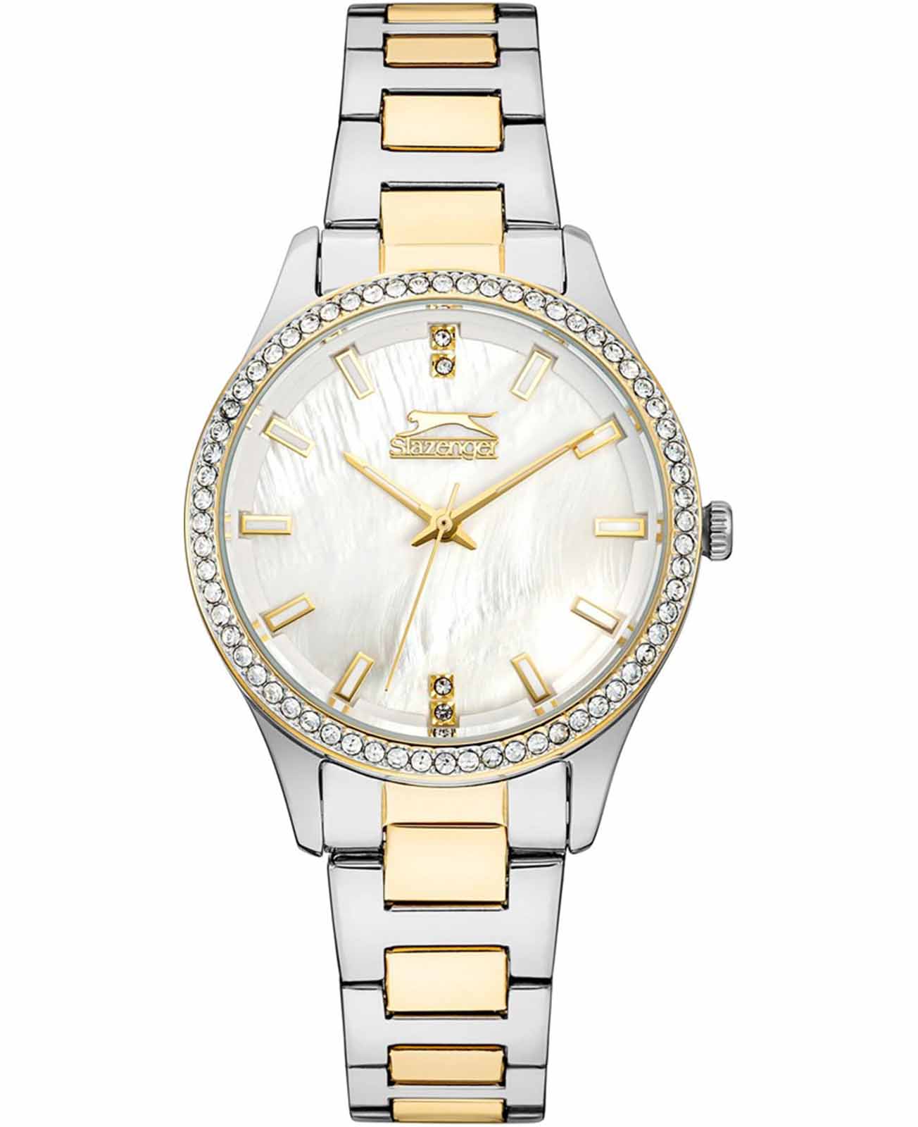 Элегантные наручные женские часы Slazenger SL.09.2222.3.03 созданы для тех, кто ценит стиль и изящество в каждом аксессуаре. Корпус диаметром 34 мм сделан из прочного металла, а безельБезельВнешний ободок, закрепляющий стекло. В спортивных часах так называется поворотное кольцо с делениями на циферблате, выполняет роль таймера – замеряет отрезки времени на шкале. Неподвижный безель – элемент декора. Однонаправленно вращающийся безель на дайверских часах позволяет фиксировать моменты погружения и выныривания на поверхность. с износостойким золотистым IP-покрытиемIP-покрытиеМетод ионного напыления. Демонстрирует повышенную устойчивость к истиранию, окислению и химическим веществам. Под воздействием высокого давления и температуры около 1500°C молекулы металла надёжно соединяются с частицами корпуса часов. усыпан фианитами, что придаёт аксессуару современный вид и долговечность. Циферблат украшен перламутровой отделкой и изящными фианитами, придающими модели особый блеск и шарм. Кварцевый механизм обеспечивает точность хода, а минеральное стеклоМинеральное стеклоМинеральное стекло представляет собой искусственно выращенный минерал кварца. Такое стекло отличается особой устойчивостью к повреждениям и царапинам. Уступает по некоторым качествам сапфировому стеклу. надежно защищает часы от случайных повреждений. Металлический браслет серебристого цвета c частичным золотистым IP-покрытиемIP-покрытиеМетод ионного напыления. Демонстрирует повышенную устойчивость к истиранию, окислению и химическим веществам. Под воздействием высокого давления и температуры около 1500°C молекулы металла надёжно соединяются с частицами корпуса часов. снабжен удобной раскладной застёжкойРаскладная застёжкаТакой тип застёжки используется только на браслетах из металла. Она никогда не раскрывается полностью, происходит разделение на 2 и более частей. Раскладывающая застёжка снизит вероятность потери часов к минимуму., что гарантирует комфортное ношение на запястье. Стрелки и метки снабжены люминесцентным покрытиемЛюминесцентное покрытиеПозволяет считывать показания времени в темноте. Производители наносят на стрелки, часовые индексы, безель или поверхность циферблата светонакопительный состав, дающий холодное свечение., что позволяет легко считывать время в темноте. Водозащита 3 ATM позволяет не беспокоиться о случайных брызгах и попадании влаги. Толщина корпуса составляет всего 10 мм, благодаря чему часы изящно смотрятся на запястье и не доставляют дискомфорта при носке. Эта модель станет отличным выбором для повседневных образов и особых случаев, подчеркивая индивидуальность и безупречный вкус своей обладательницы.