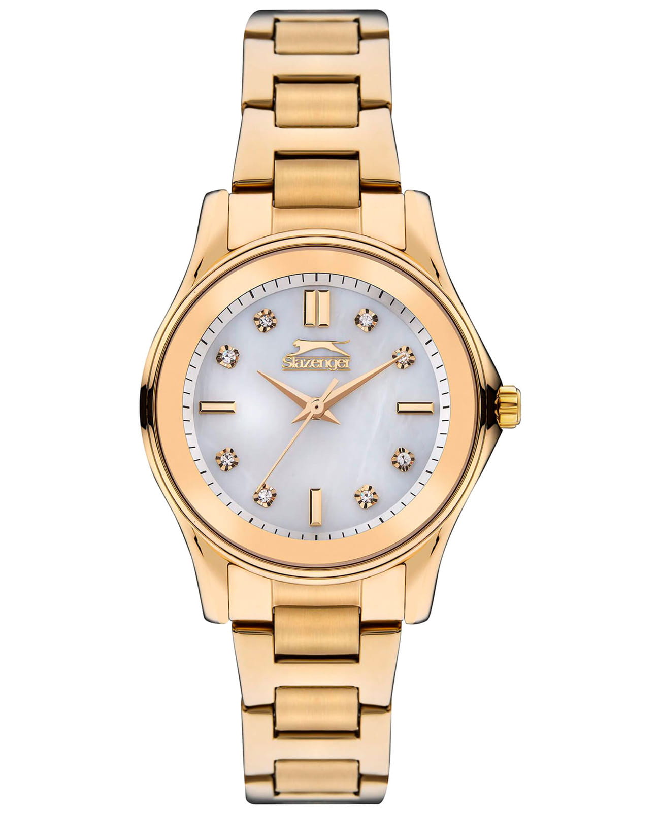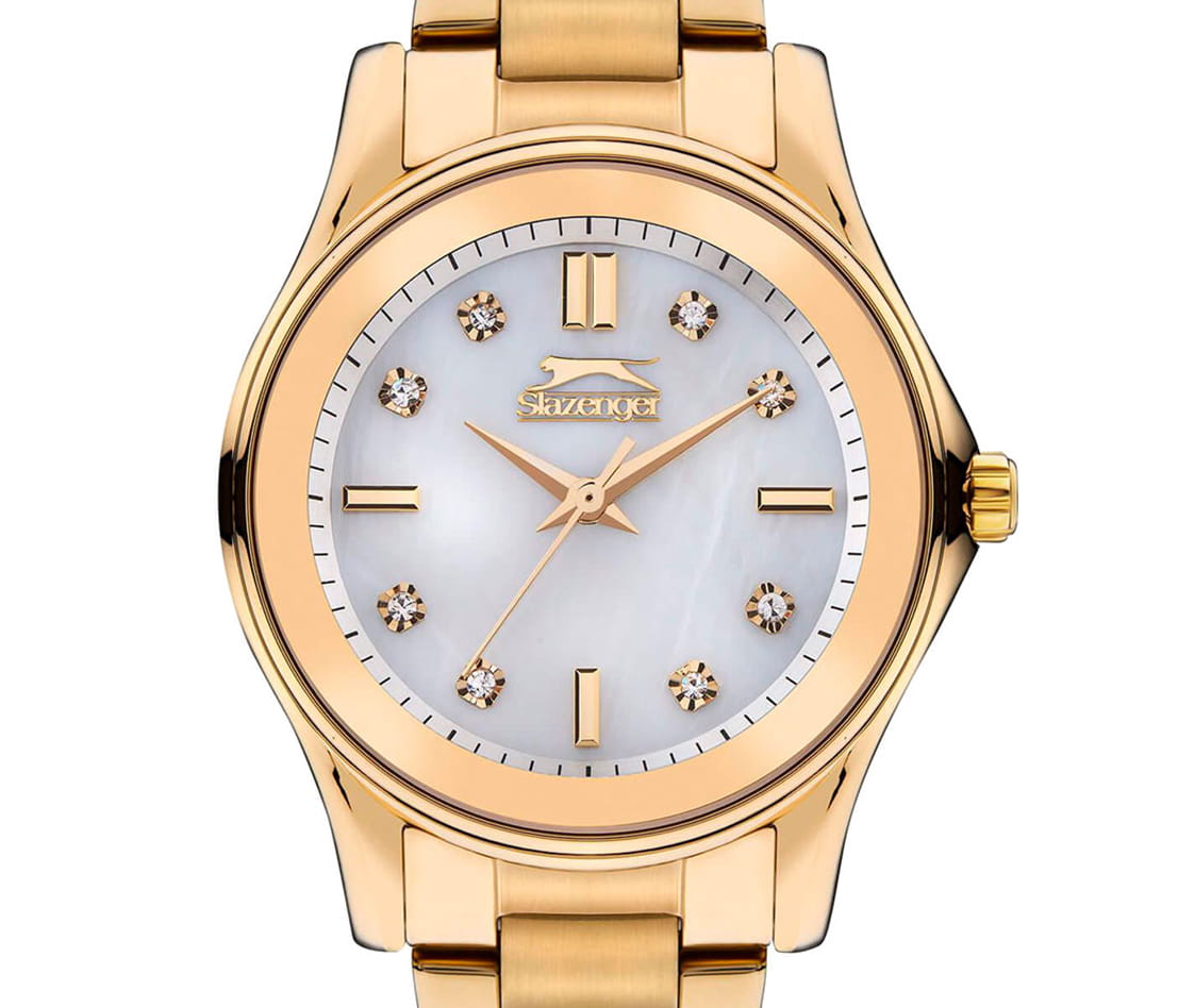 Женские наручные часы Slazenger SL.09.2235.3.06 сочетают в себе классический дизайн и надежность современных технологий. Модель обладает круглым корпусом диаметром 32 мм, изготовленным из суперметалла с IP-покрытиемIP-покрытиеМетод ионного напыления. Демонстрирует повышенную устойчивость к истиранию, окислению и химическим веществам. Под воздействием высокого давления и температуры около 1500°C молекулы металла надёжно соединяются с частицами корпуса часов., что обеспечивает высокую устойчивость к внешним воздействиям. Индексы украшены фианитами. Браслет выполнен из суперметалла с IP-покрытиемIP-покрытиеМетод ионного напыления. Демонстрирует повышенную устойчивость к истиранию, окислению и химическим веществам. Под воздействием высокого давления и температуры около 1500°C молекулы металла надёжно соединяются с частицами корпуса часов., имеет раскладную застежкуРаскладной замокДанный вариант застежки используется только на часах с металлическим браслетом. Отличительная особенность такого крепления в том, что длина браслета становится универсальной и вы можете самостоятельно отрегулировать нужный вам размер – застежка просто двигается по браслету часов., гарантирующую комфортное ношение и безопасность. Циферблат перламутрового цвета декорирован золотистыми стрелками и индексами, которые обеспечивают читаемость времени даже в условиях недостаточной освещенности. Для защиты используется минеральное стеклоМинеральное стеклоМинеральное стекло представляет собой искусственно выращенный минерал кварца. Такое стекло отличается особой устойчивостью к повреждениям и царапинам. Уступает по некоторым качествам сапфировому стеклу., обеспечивающее прочную защиту от царапин. Часы работают на кварцевом механизме, что гарантирует точное время без необходимости подзаводки. Водонепроницаемость часов достигает 3 атмосфер, что позволяет использовать их при мытье рук или хождении под мелким дождем, однако не рекомендуется для плавания или других водных видов спорта. Вес модели составляет 72 грамма.