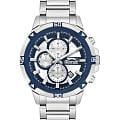 Часы Slazenger SL.09.2249.2.02 — это стильная и практичная модель, выполненная в элегантном серебристом цвете. Корпус и браслет изготовлены из металла, что обеспечивает прочность и долговечность. На безельБезельВнешний ободок, закрепляющий стекло. В спортивных часах так называется поворотное кольцо с делениями на циферблате, выполняет роль таймера – замеряет отрезки времени на шкале. Неподвижный безель – элемент декора. Однонаправленно вращающийся безель на дайверских часах позволяет фиксировать моменты погружения и выныривания на поверхность. частично нанесено синее IP-покрытиеIP-покрытиеМетод ионного напыления. Демонстрирует повышенную устойчивость к истиранию, окислению и химическим веществам. Под воздействием высокого давления и температуры около 1500°C молекулы металла надёжно соединяются с частицами корпуса часов.. Минеральное стеклоМинеральное стеклоМинеральное стекло представляет собой искусственно выращенный минерал кварца. Такое стекло отличается особой устойчивостью к повреждениям и царапинам. Уступает по некоторым качествам сапфировому стеклу. надежно защищает сине-серебристый циферблат от царапин и повреждений. Диаметр корпуса составляет 45 мм, а толщина — 12 мм, благодаря чему часы смотрятся солидно и современно. Модель оснащена кварцевым механизмом, отличающимся точностью и надежностью. На циферблате представлены дополнительные малые циферблаты для отображения второго часового поясаВторой часовой поясФункция, позволяющая отображать время двух часовых поясов одновременно., дня недели и времени в 24-часовом формате, а также имеется отдельное окошко даты. Для удобства использования в темное время суток предусмотрено люминесцентное покрытиеЛюминесцентное покрытиеПозволяет считывать показания времени в темноте. Производители наносят на стрелки, часовые индексы, безель или поверхность циферблата светонакопительный состав, дающий холодное свечение. стрелок и меток. Удобный металлический браслет шириной 22 мм снабжен раскладной застёжкойРаскладная застёжкаТакой тип застёжки используется только на браслетах из металла. Она никогда не раскрывается полностью, происходит разделение на 2 и более частей. Раскладывающая застёжка снизит вероятность потери часов к минимуму., обеспечивающей надежную фиксацию на запястье. Заводная головка оснащена защитой. Водозащита уровня WR 50 позволяет не снимать часы при мытье рук или попадании под дождь. Вес модели составляет 151 грамм.