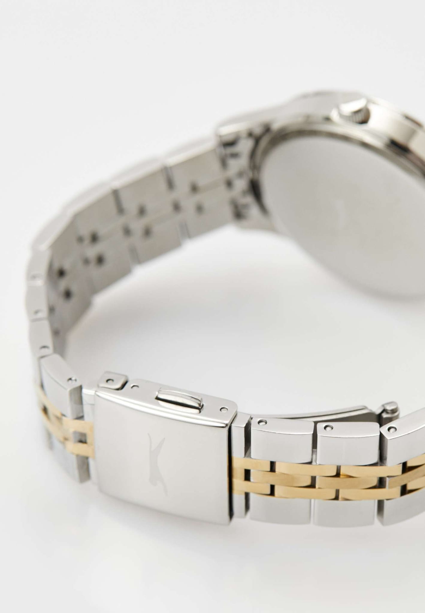 Женские наручные часы Slazenger SL.09.2295.3.02 — это элегантный аксессуар, который подчеркнет утончённый стиль своей обладательницы. Корпус диаметром 36 мм и толщиной 11,5 мм выполнен из прочного металла и надёжно защищён минеральным стекломМинеральное стеклоМинеральное стекло представляет собой искусственно выращенный минерал кварца. Такое стекло отличается особой устойчивостью к повреждениям и царапинам. Уступает по некоторым качествам сапфировому стеклу., устойчивым к царапинам. Зеленый циферблат украшен изящными кристаллами, придающими часам особый блеск и изысканность. Модель оснащена люминесцентным покрытиемЛюминесцентное покрытиеПозволяет считывать показания времени в темноте. Производители наносят на стрелки, часовые индексы, безель или поверхность циферблата светонакопительный состав, дающий холодное свечение. стрелок, что облегчает считывание времени в темноте. Особое внимание привлекает безельБезельВнешний ободок, закрепляющий стекло. В спортивных часах так называется поворотное кольцо с делениями на циферблате, выполняет роль таймера – замеряет отрезки времени на шкале. Неподвижный безель – элемент декора. Однонаправленно вращающийся безель на дайверских часах позволяет фиксировать моменты погружения и выныривания на поверхность. с черным IP-покрытиемIP-покрытиеМетод ионного напыления. Демонстрирует повышенную устойчивость к истиранию, окислению и химическим веществам. Под воздействием высокого давления и температуры около 1500°C молекулы металла надёжно соединяются с частицами корпуса часов.. Металлический браслет с частичным золотистым IP-покрытиемIP-покрытиеМетод ионного напыления. Демонстрирует повышенную устойчивость к истиранию, окислению и химическим веществам. Под воздействием высокого давления и температуры около 1500°C молекулы металла надёжно соединяются с частицами корпуса часов. шириной 16 мм оснащён удобной раскладной застёжкойРаскладная застёжкаТакой тип застёжки используется только на браслетах из металла. Она никогда не раскрывается полностью, происходит разделение на 2 и более частей. Раскладывающая застёжка снизит вероятность потери часов к минимуму. для комфортной посадки на запястье. Кварцевый механизм обеспечивает точность хода, а водозащита уровня WR 30 защищает часы от случайных брызг. Для удобства в условиях плохой освещённости предусмотрена подсветка стрелок. Вес изделия составляет 95 граммов.