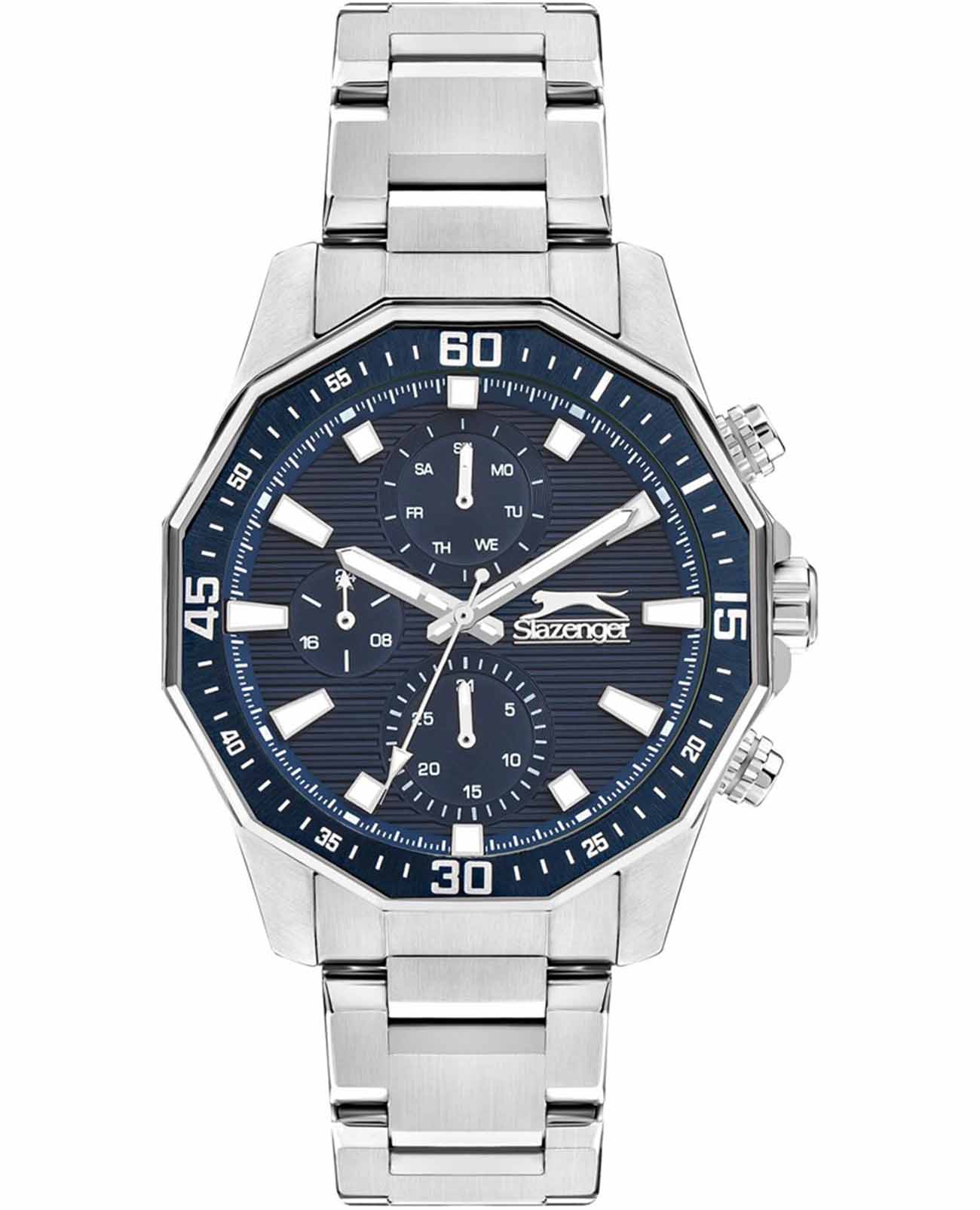 Стильные наручные часы Slazenger SL.09.2297.2.01 созданы для ценителей надежности и современного дизайна. Классический металлический корпус и серебристый браслет гармонично сочетают элегантность и практичность. Кварцевый механизм обеспечивает точность хода, а минеральное стеклоМинеральное стеклоМинеральное стекло представляет собой искусственно выращенный минерал кварца. Такое стекло отличается особой устойчивостью к повреждениям и царапинам. Уступает по некоторым качествам сапфировому стеклу. защищает циферблат от царапин. Особое внимание привлекает безельБезельВнешний ободок, закрепляющий стекло. В спортивных часах так называется поворотное кольцо с делениями на циферблате, выполняет роль таймера – замеряет отрезки времени на шкале. Неподвижный безель – элемент декора. Однонаправленно вращающийся безель на дайверских часах позволяет фиксировать моменты погружения и выныривания на поверхность. с синим IP-покрытиемIP-покрытиеМетод ионного напыления. Демонстрирует повышенную устойчивость к истиранию, окислению и химическим веществам. Под воздействием высокого давления и температуры около 1500°C молекулы металла надёжно соединяются с частицами корпуса часов.. На дополнительных малых циферблатах отображаются день недели, число и текущее время в 24-часовом формате. Модель оснащена люминесцентным покрытиемЛюминесцентное покрытиеПозволяет считывать показания времени в темноте. Производители наносят на стрелки, часовые индексы, безель или поверхность циферблата светонакопительный состав, дающий холодное свечение. стрелок и меток, что облегчает считывание времени в темноте. Водозащита 50 метров позволяет не снимать часы во время дождя или мытья рук. Заводная головка оснащена защитой, а задняя крышка завинчивается для дополнительной безопасности. Браслет снабжен удобной раскладной застёжкойРаскладная застёжкаТакой тип застёжки используется только на браслетах из металла. Она никогда не раскрывается полностью, происходит разделение на 2 и более частей. Раскладывающая застёжка снизит вероятность потери часов к минимуму.. Диаметр корпуса составляет 43 мм, толщина — 13 мм, ширина ремешка 22 мм, а вес часов — 167 грамм.