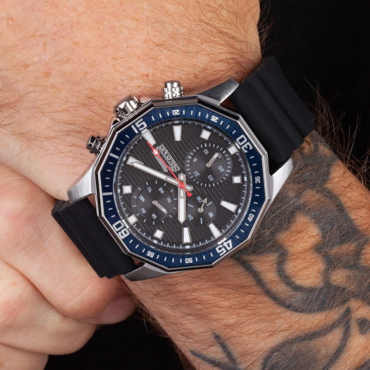 Мужские кварцевые часы Slazenger SL.09.2298.2.01 — это выразительный и функциональный аксессуар, сочетающий прочность, стиль и насыщенную комплектацию. Корпус выполнен из суперметалла с PVD-покрытиемPVDУльтратонкое покрытие наносится в технике вакуумного напыления, сочетает в себе нитрид титана особой прочности со слоем золота или оксида хрома. Несёт в себе декоративную или защитную функцию., а лицевая часть защищена минеральным стекломМинеральное стеклоМинеральное стекло представляет собой искусственно выращенный минерал кварца. Такое стекло отличается особой устойчивостью к повреждениям и царапинам. Уступает по некоторым качествам сапфировому стеклу.. Циферблат чёрного цвета оформлен с вынесенными малыми циферблатами для индикации дня недели, даты и 24-часового формата времени. Стрелки и метки покрыты люминесцентным покрытиемЛюминесцентное покрытиеПозволяет считывать показания времени в темноте. Производители наносят на стрелки, часовые индексы, безель или поверхность циферблата светонакопительный состав, дающий холодное свечение., что обеспечивает хорошую читаемость в темноте. Часы оснащены силиконовым ремешком, фиксирующимся на стандартной застёжке. Водонепроницаемость 50 м позволяет использовать часы в повседневных условиях, защищая от случайных брызг и капель дождя. Модель подчёркивает индивидуальность владельца и идеально подходит как для повседневного, так и для спортивного образа.