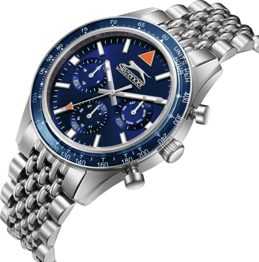 Мужские кварцевые часы Slazenger SL.09.2360.2.03 – идеальное сочетание классического дизайна и современных технологий, созданное для уверенных в себе мужчин. Корпус выполнен из суперметалла серебристого цвета, диаметром 43 мм и толщиной 12 мм, подчёркивает надежность модели и делает их идеальным аксессуаром для любой ситуации – будь то деловая встреча или повседневные выходы. Циферблат надёжно защищён минеральным стекломМинеральное стеклоМинеральное стекло представляет собой искусственно выращенный минерал кварца. Такое стекло отличается особой устойчивостью к повреждениям и царапинам. Уступает по некоторым качествам сапфировому стеклу., которое устойчиво к механическим повреждениям и сохраняет кристальную прозрачность. Неподвижный безельБезельВнешний ободок, закрепляющий стекло. В спортивных часах так называется поворотное кольцо с делениями на циферблате, выполняет роль таймера – замеряет отрезки времени на шкале. Неподвижный безель – элемент декора. Однонаправленно вращающийся безель на дайверских часах позволяет фиксировать моменты погружения и выныривания на поверхность. с IP-покрытиемIP-покрытиеМетод ионного напыления. Демонстрирует повышенную устойчивость к истиранию, окислению и химическим веществам. Под воздействием высокого давления и температуры около 1500°C молекулы металла надёжно соединяются с частицами корпуса часов. синего цвета. Стальной браслет на раскладной застёжкеРаскладная застёжкаТакой тип застёжки используется только на браслетах из металла. Она никогда не раскрывается полностью, происходит разделение на 2 и более частей. Раскладывающая застёжка снизит вероятность потери часов к минимуму. удобно облегает запястье, обеспечивая надёжность и комфорт в повседневном ношении. Стрелки и метки покрыты люминесцентным покрытиемЛюминесцентное покрытиеПозволяет считывать показания времени в темноте. Производители наносят на стрелки, часовые индексы, безель или поверхность циферблата светонакопительный состав, дающий холодное свечение., обеспечивающим отличную читаемость в темноте. Эти часы станут не просто аксессуаром, а надежным спутником в любой ситуации, подчеркивая ваш безупречный вкус и деловой стиль. Вынесенный циферблат с 24-х часовым указателем времени и функция тахиметраТахиметрРазмеченная шкала, располагается на ободке или безеле часов. Тахиметр позволяет рассчитать скорость на определённом участке пути, расстояние измеряется в километрах или милях.. Водозащита 50 метров позволит защитить корпус от случайных брызг или капель дождя.