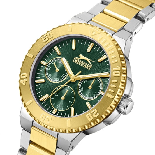 Женские кварцевые часы Slazenger — это выразительный и функциональный аксессуар. Корпус диаметром 36 мм и толщиной 9,5 мм выполнен из суперметалла. БезельБезельВнешний ободок, закрепляющий стекло. В спортивных часах так называется поворотное кольцо с делениями на циферблате, выполняет роль таймера – замеряет отрезки времени на шкале. Неподвижный безель – элемент декора. Однонаправленно вращающийся безель на дайверских часах позволяет фиксировать моменты погружения и выныривания на поверхность. из суперметалла с IP-покрытиемIP-покрытиеМетод ионного напыления. Демонстрирует повышенную устойчивость к истиранию, окислению и химическим веществам. Под воздействием высокого давления и температуры около 1500°C молекулы металла надёжно соединяются с частицами корпуса часов.. Циферблат зелёного цвета оформлен индексами и стрелками. Циферблат защищён минеральным стекломМинеральное стеклоМинеральное стекло представляет собой искусственно выращенный минерал кварца. Такое стекло отличается особой устойчивостью к повреждениям и царапинам. Уступает по некоторым качествам сапфировому стеклу.. Механизм — кварцевый. Часы оснащены индикацией дня недели, даты и 12/24-часового формата времени. Часы оснащены браслетом из суперметалла с IP-покрытиемIP-покрытиеМетод ионного напыления. Демонстрирует повышенную устойчивость к истиранию, окислению и химическим веществам. Под воздействием высокого давления и температуры около 1500°C молекулы металла надёжно соединяются с частицами корпуса часов. и раскладной застёжкойРаскладная застёжкаТакой тип застёжки используется только на браслетах из металла. Она никогда не раскрывается полностью, происходит разделение на 2 и более частей. Раскладывающая застёжка снизит вероятность потери часов к минимуму.. Водонепроницаемость 50 м позволяет использовать часы в повседневных условиях. Гарантия — 12 месяцев. Идеальный выбор для тех, кто ценит стиль, функциональность и качество.