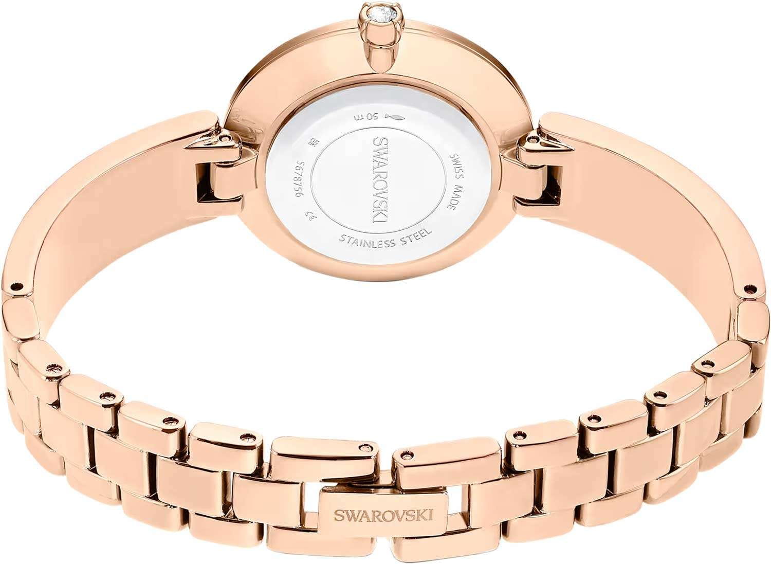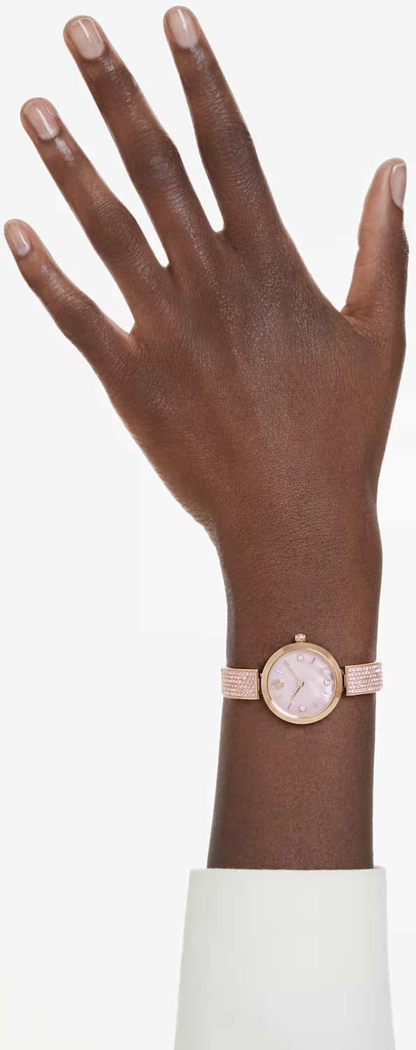 Часы Swarovski 5678756 – это воплощение изысканного дизайна и функциональности, созданное для тех, кто ценит красоту и точность. Произведенные в Швейцарии, эти кварцевые часы представлены в элегантном корпусе с безелемБезельВнешний ободок, закрепляющий стекло. В спортивных часах так называется поворотное кольцо с делениями на циферблате, выполняет роль таймера – замеряет отрезки времени на шкале. Неподвижный безель – элемент декора. Однонаправленно вращающийся безель на дайверских часах позволяет фиксировать моменты погружения и выныривания на поверхность. из нержавеющей стали с розовым PVDPVDУльтратонкое покрытие наносится в технике вакуумного напыления, сочетает в себе нитрид титана особой прочности со слоем золота или оксида хрома. Несёт в себе декоративную или защитную функцию. покрытием. Под минеральным стекломМинеральное стеклоМинеральное стекло представляет собой искусственно выращенный минерал кварца. Такое стекло отличается особой устойчивостью к повреждениям и царапинам. Уступает по некоторым качествам сапфировому стеклу. открывается перламутровый розовый циферблат, дополненный логотипом Swarovski в виде лебедя на 12 часах и кристаллами на отметках 3, 6 и 9 часов. Отсутствие секундной стрелки подчеркивает минимализм и утонченность дизайна. Заводная головка украшена кристаллом круглой огранки, добавляющим блеска и завершенности образу. Стальной браслет с розовым PVDPVDУльтратонкое покрытие наносится в технике вакуумного напыления, сочетает в себе нитрид титана особой прочности со слоем золота или оксида хрома. Несёт в себе декоративную или защитную функцию. покрытием декорирован прозрачными кристаллами Swarovski, создающими неповторимый мерцающий эффект, а ювелирная застежка обеспечивает надежность и комфорт. Водозащита 50WR делает их устойчивыми к влаге, позволяя наслаждаться стильным аксессуаром в любых условиях.