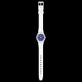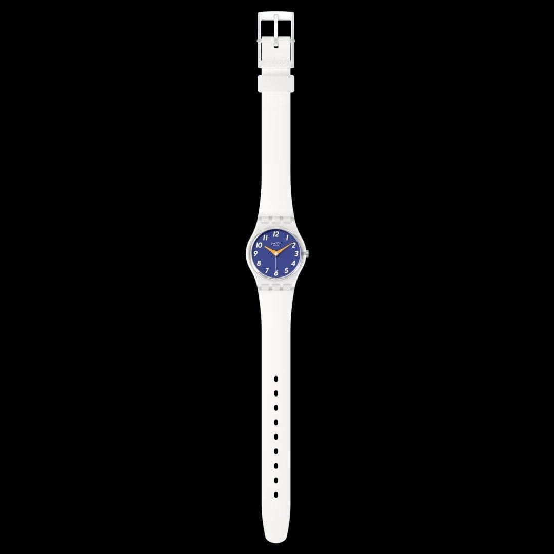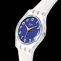Озорная модель часов Swatch Lady LE108 из коллекции Swatch Lady. Эти часы имеют прозрачный корпус и синий циферблат с белыми печатными цифрами и стрелками оранжевого цвета, что придает им яркий и игривый вид. С лицевой стороны ремешок белый, а с оборотной – желтый и фактурный, что добавляет оригинальности. Водостойкость модели составляет 30 метров, что делает их подходящими для повседневного использования.