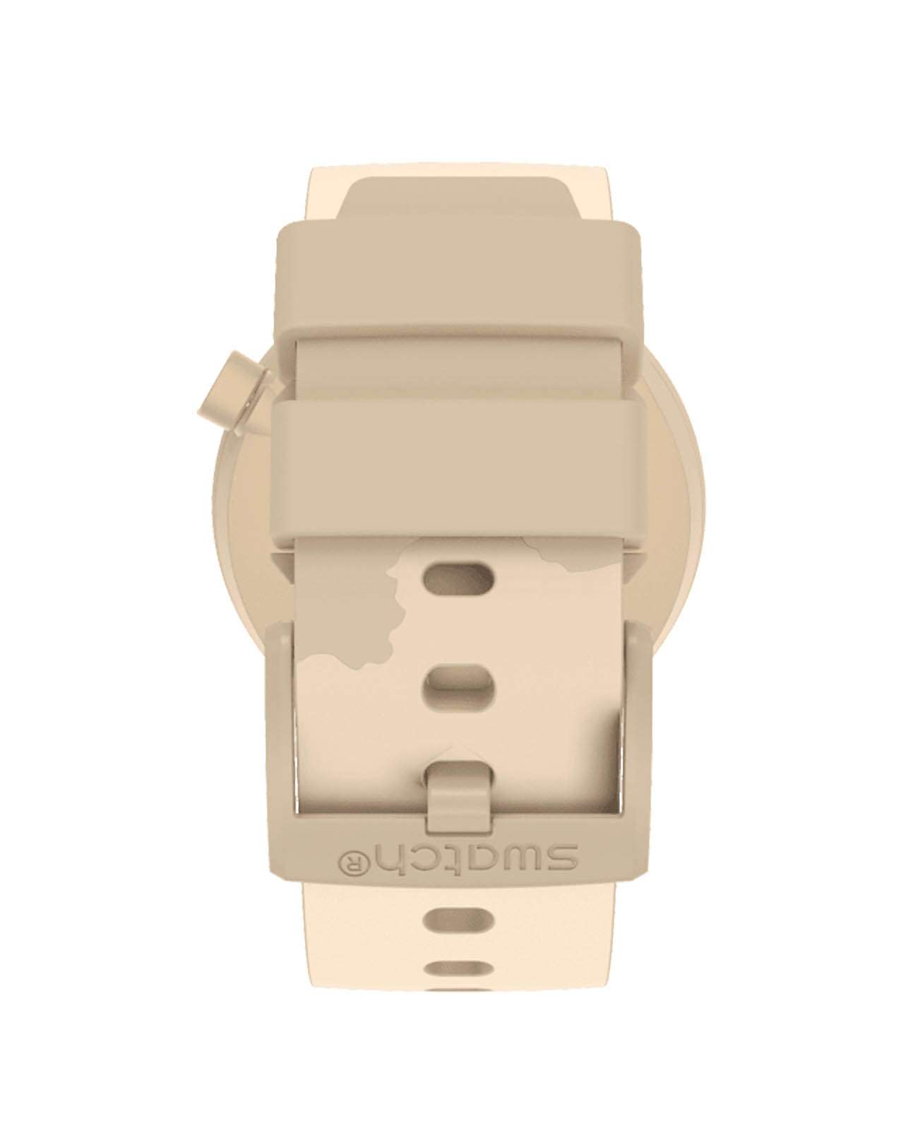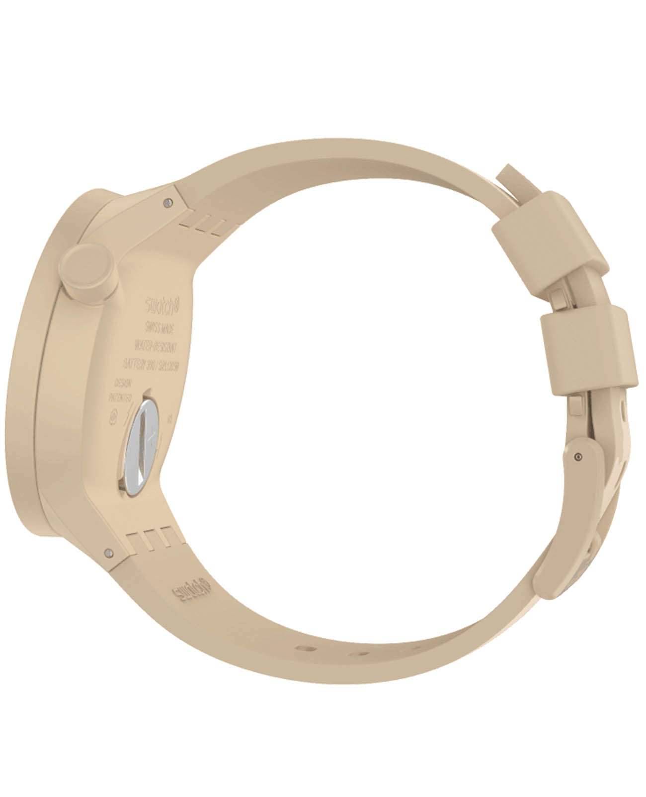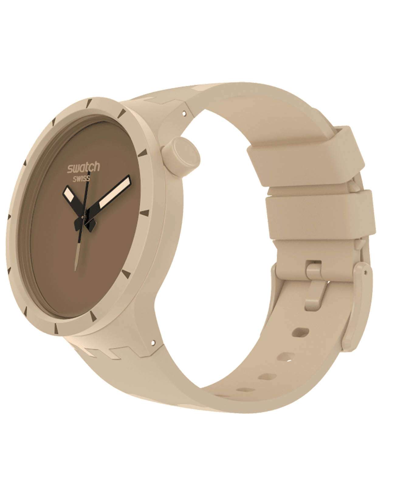 Часы Swatch SB03C101 — это стильный и современный аксессуар для тех, кто ценит лёгкость и комфорт. Часы идеально подойдут как для мужчин, так и для женщин. Корпус из биокерамикиБиокерамикаБиокерамика — это материал, который на две трети состоит из керамики, на одну треть — из биопластика. Он сочетает в себе лучшие качества обоих материалов и обладает прочностью и шелковистой на ощупь текстурой., а ремешок — из однотонного матово-бежевого силикона. Коричневый циферблат подчеркивает белые акценты на темных стрелках. Секундная стрелка, прообразом которой стала стрелка компаса, усиливает дух приключений. На часовую и минутную стрелки нанесено люминесцентное покрытиеЛюминесцентное покрытиеПозволяет считывать показания времени в темноте. Производители наносят на стрелки, часовые индексы, безель или поверхность циферблата светонакопительный состав, дающий холодное свечение., которое светится в темноте, создавая необычное изображение. Водозащита 30 метров делает часы практичными для повседневного использования. Эти часы подойдут для повседневного ношения и станут ярким акцентом в вашем наряде.