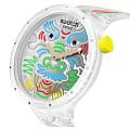 Часы Swatch SB05Z102 — это стильный и современный аксессуар для тех, кто ценит лёгкость и комфорт. Часы идеально подойдут как для мужчин, так и для женщин. Полупрозрачный корпус и стекло этих крупных часов изготовлены из биоматериала, а серебристый циферблат украшен цветным изображением дракона. Модель оснащена полупрозрачным матово-белым ремешком с красочным принтом, серебристой пряжкой и двумя тренчиками: белым с серебряной надписью и серебристым с красной. На часовую и минутную стрелки нанесено люминесцентное покрытиеЛюминесцентное покрытиеПозволяет считывать показания времени в темноте. Производители наносят на стрелки, часовые индексы, безель или поверхность циферблата светонакопительный состав, дающий холодное свечение., которое светится в темноте, создавая необычное изображение. Водозащита 30 метров делает часы практичными для повседневного использования. Эти часы подойдут для повседневного ношения и станут ярким акцентом в вашем наряде.