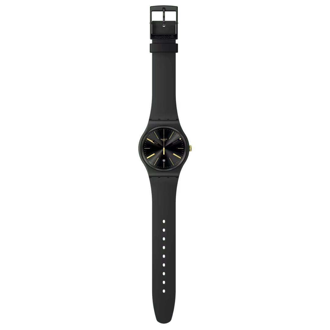 Часы Swatch SO29B403 —  эффектный и надежный аксессуар. Современный взгляд на классику. Эти часы имеют черный циферблат с золотыми индексами и черными стрелками часов и минут, которые светятся в темноте, так как имеют люминесцентное покрытиеЛюминесцентное покрытиеПозволяет считывать показания времени в темноте. Производители наносят на стрелки, часовые индексы, безель или поверхность циферблата светонакопительный состав, дающий холодное свечение.. Корпус и стекло из биоматериала. Матовый черный ремешок из биоматериала с соответствующей петлей и пряжкой завершает их неповторимый вид. Внутри часов установлен надежный кварцевый механизм, который обеспечивает точность хода. Эти часы водонепроницаемы до 30 метров, что позволяет не беспокоиться о случайных брызгах или дождевых каплях. Swatch SO29B403 — это идеальный выбор для тех, кто ценит сочетание стиля, комфорта и функциональности в одном аксессуаре.