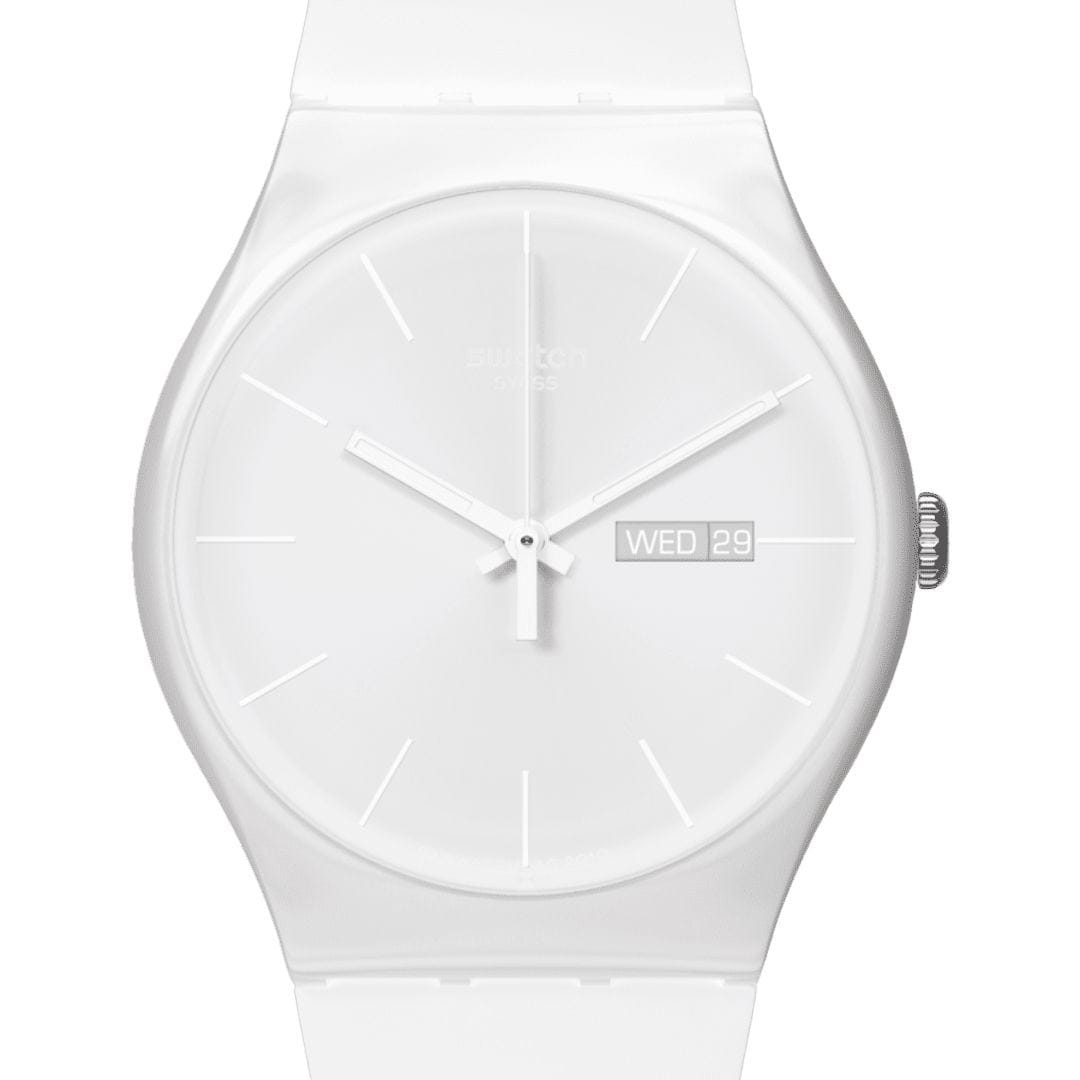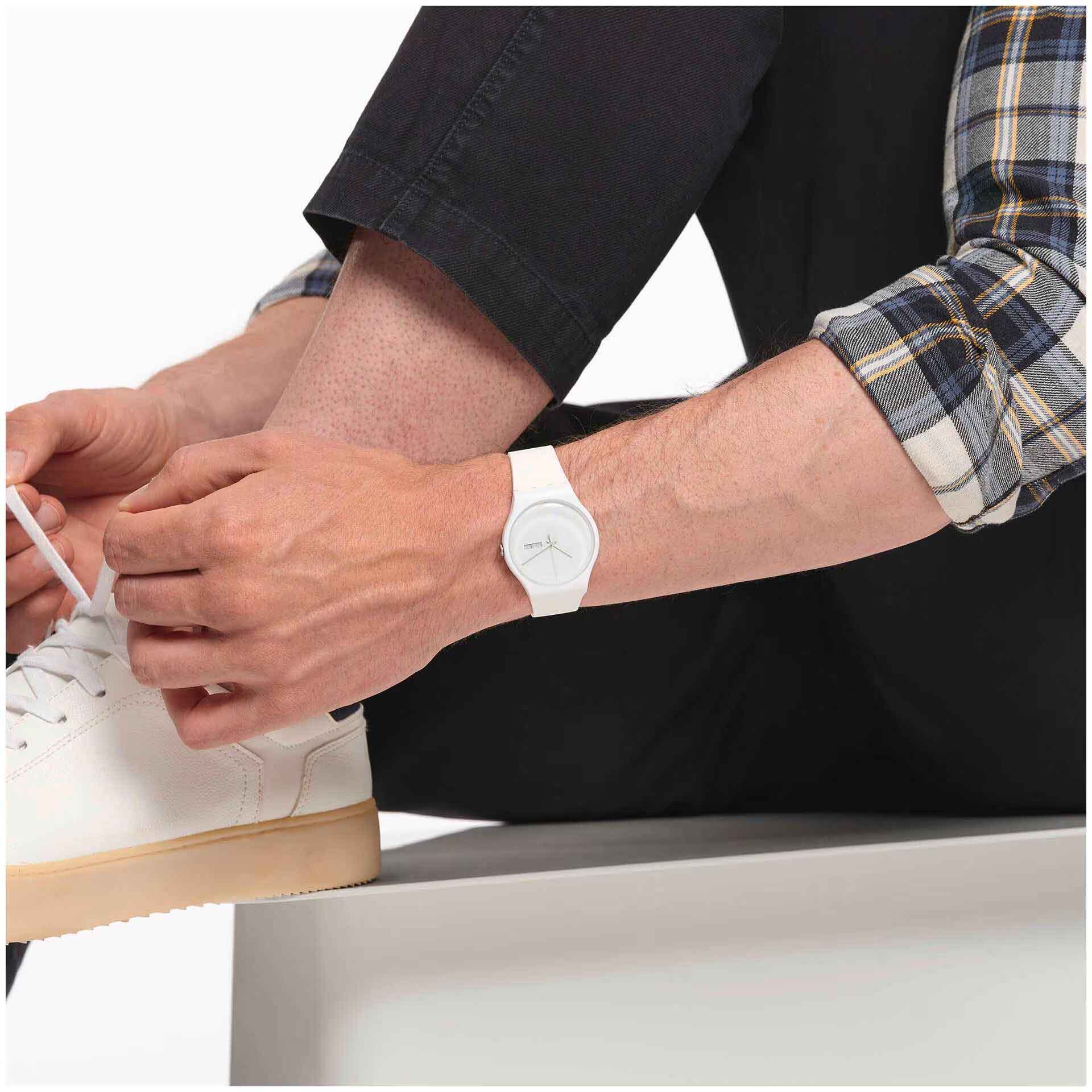 Часы Swatch SO29W704-S14 —  эффектный и удобный аксессуар. Современный взгляд на классику. Любителем белой роскоши!  Белый корпус из биоматериала, белые стрелки с  люминесцентным покрытиемЛюминесцентное покрытиеПозволяет считывать показания времени в темноте. Производители наносят на стрелки, часовые индексы, безель или поверхность циферблата светонакопительный состав, дающий холодное свечение. и бело-серое окошко даты и дня недели в положении 3 часов. Ремешок из силикона на стандартной застёжке. Внутри часов установлен надежный кварцевый механизм, который обеспечивает точность хода. Эти часы водонепроницаемы до 30 метров, что позволяет не беспокоиться о случайных брызгах или дождевых каплях. Swatch SO29W704-S14 — это идеальный выбор для тех, кто ценит сочетание стиля, комфорта и функциональности в одном аксессуаре.