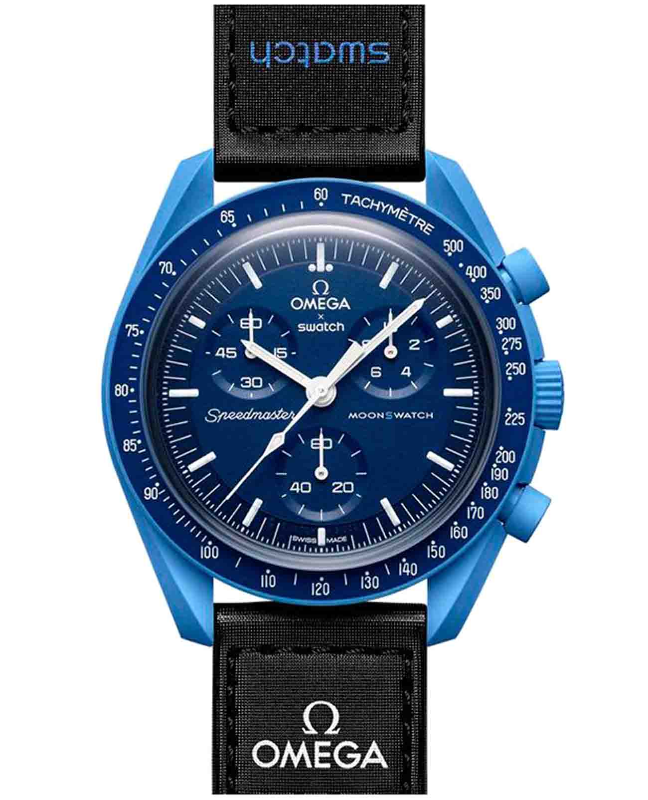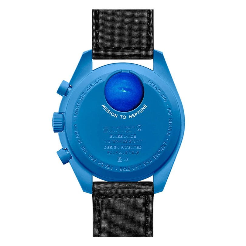 Часы Swatch Bioceramic Moonswatch MISSION TO NEPTUNE SO33N100 — это стильный и современный аксессуар для тех, кто ценит лёгкость и комфорт. Корпус диаметром 42 мм и пряжка этих уникальных часов изготовлены из биокерамикиБиокерамикаБиокерамика — это материал, который на две трети состоит из керамики, на одну треть — из биопластика. Он сочетает в себе лучшие качества обоих материалов и обладает прочностью и шелковистой на ощупь текстурой., а также ремешок VELCRO®. Модель оснащена синим циферблатом и биокерамическим безелемБезельВнешний ободок, закрепляющий стекло. В спортивных часах так называется поворотное кольцо с делениями на циферблате, выполняет роль таймера – замеряет отрезки времени на шкале. Неподвижный безель – элемент декора. Однонаправленно вращающийся безель на дайверских часах позволяет фиксировать моменты погружения и выныривания на поверхность. на который нанесена шкала тахиметраТахиметрРазмеченная шкала, располагается на ободке или безеле часов. Тахиметр позволяет рассчитать скорость на определённом участке пути, расстояние измеряется в километрах или милях.. Общими характеристиками всех часов в данной коллекции являются конструкция стекла из биоматериала, «скрытая» в центре кристалла буква "S", тонкий и изящный круговой узор на внешнем кольце циферблата и заглубленных мини-циферблатах, гладкие ушки с заостренными концами, культовая точка над отметкой 90 на тахиметрической шкале безеля и, конечно же, уникальный материал – биокерамика. Индексы, часовая, минутная и секундная стрелки хронографаХронографФункция позволяет измерять отрезки времени с особой точностью: часы, минуты, секунды. Верным признаком хронографа является наличие на циферблате 3 дополнительных окошек-счётчиков. покрыты люминесцентным покрытиемЛюминесцентное покрытиеПозволяет считывать показания времени в темноте. Производители наносят на стрелки, часовые индексы, безель или поверхность циферблата светонакопительный состав, дающий холодное свечение. Super-LumiNova® класса А, благодаря чему они светятся в темноте. Циферблаты каждых часов в данной коллекции украшены фирменным знаком OMEGA X Swatch, культовым логотипом Speedmaster и логотипом MoonSwatch.