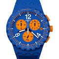 Часы Swatch SUSN419 — это стильный и современный аксессуар для тех, кто ценит лёгкость и комфорт. Часы идеально подойдут как для мужчин, так и для женщин. На циферблате этого синего хронографаХронографФункция позволяет измерять отрезки времени с особой точностью: часы, минуты, секунды. Верным признаком хронографа является наличие на циферблате 3 дополнительных окошек-счётчиков. с контрастными оранжевыми и белыми принтами размещены стрелки и индексы, светящиеся в темноте благодаря люминесцентному покрытиюЛюминесцентное покрытиеПозволяет считывать показания времени в темноте. Производители наносят на стрелки, часовые индексы, безель или поверхность циферблата светонакопительный состав, дающий холодное свечение.. Яркую синюю однотонность спортивных часов довершают ремешок, тренчик и пряжка. Над фоне матового корпуса и такого же ремешка с тренчиком и пряжкой в тон рельефно выделяется синий безельБезельВнешний ободок, закрепляющий стекло. В спортивных часах так называется поворотное кольцо с делениями на циферблате, выполняет роль таймера – замеряет отрезки времени на шкале. Неподвижный безель – элемент декора. Однонаправленно вращающийся безель на дайверских часах позволяет фиксировать моменты погружения и выныривания на поверхность. с оранжевым принтом. Водозащита 30 метров делает часы практичными для повседневного использования. Эти часы подойдут для повседневного ношения и станут ярким акцентом в вашем наряде.