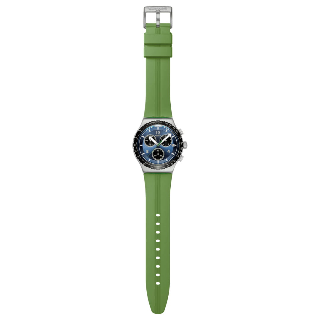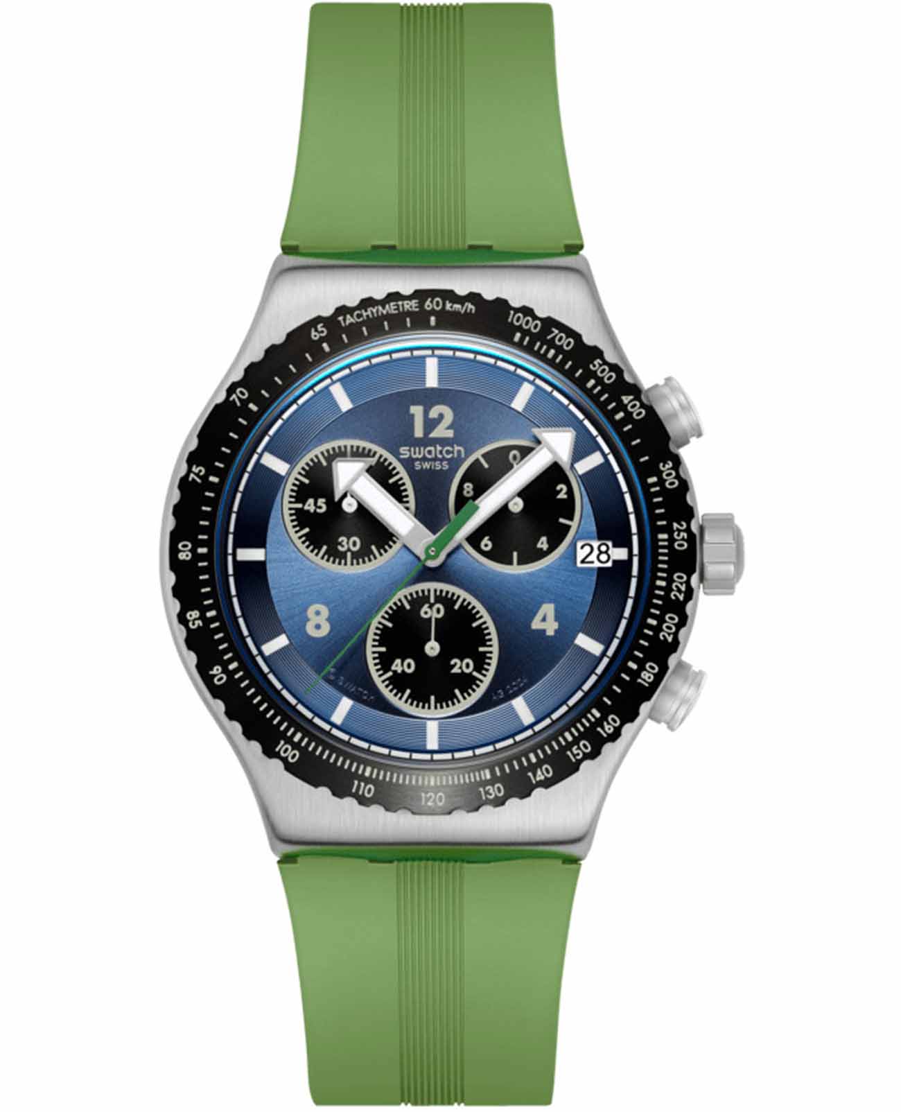 Часы Swatch YVS531 — это стильный и современный аксессуар для тех, кто ценит лёгкость и комфорт. Этот стальной хронографХронографФункция позволяет измерять отрезки времени с особой точностью: часы, минуты, секунды. Верным признаком хронографа является наличие на циферблате 3 дополнительных окошек-счётчиков. оснащен синим циферблатом с радиальной полировкой, черными дополнительными циферблатами, белыми цифрами, светящимися в темноте часовыми индексами из-за люминесцентного покрытияЛюминесцентное покрытиеПозволяет считывать показания времени в темноте. Производители наносят на стрелки, часовые индексы, безель или поверхность циферблата светонакопительный состав, дающий холодное свечение., а также белым окошком календаря с черным принтом в районе отметки 3 часа. Отсчет времени ведут остроконечные часовая и минутная стрелки серебристой расцветки, светящиеся в темноте из-за люминесцентного покрытияЛюминесцентное покрытиеПозволяет считывать показания времени в темноте. Производители наносят на стрелки, часовые индексы, безель или поверхность циферблата светонакопительный состав, дающий холодное свечение., а также зеленая секундная стрелка хронографаХронографФункция позволяет измерять отрезки времени с особой точностью: часы, минуты, секунды. Верным признаком хронографа является наличие на циферблате 3 дополнительных окошек-счётчиков.. Часы заключены в матовый стальной корпус, на безельБезельВнешний ободок, закрепляющий стекло. В спортивных часах так называется поворотное кольцо с делениями на циферблате, выполняет роль таймера – замеряет отрезки времени на шкале. Неподвижный безель – элемент декора. Однонаправленно вращающийся безель на дайверских часах позволяет фиксировать моменты погружения и выныривания на поверхность. с черным PVDPVDУльтратонкое покрытие наносится в технике вакуумного напыления, сочетает в себе нитрид титана особой прочности со слоем золота или оксида хрома. Несёт в себе декоративную или защитную функцию. покрытием нанесена белая шкала тахиметраТахиметрРазмеченная шкала, располагается на ободке или безеле часов. Тахиметр позволяет рассчитать скорость на определённом участке пути, расстояние измеряется в километрах или милях.. Модель дополнена структурированным матово-зеленым ремешком с тренчиками в тон и матовой полупряжкой из стали. Водозащита 30 метров делает часы практичными для повседневного использования. Эти часы подойдут для повседневного ношения и станут ярким акцентом в вашем наряде.
