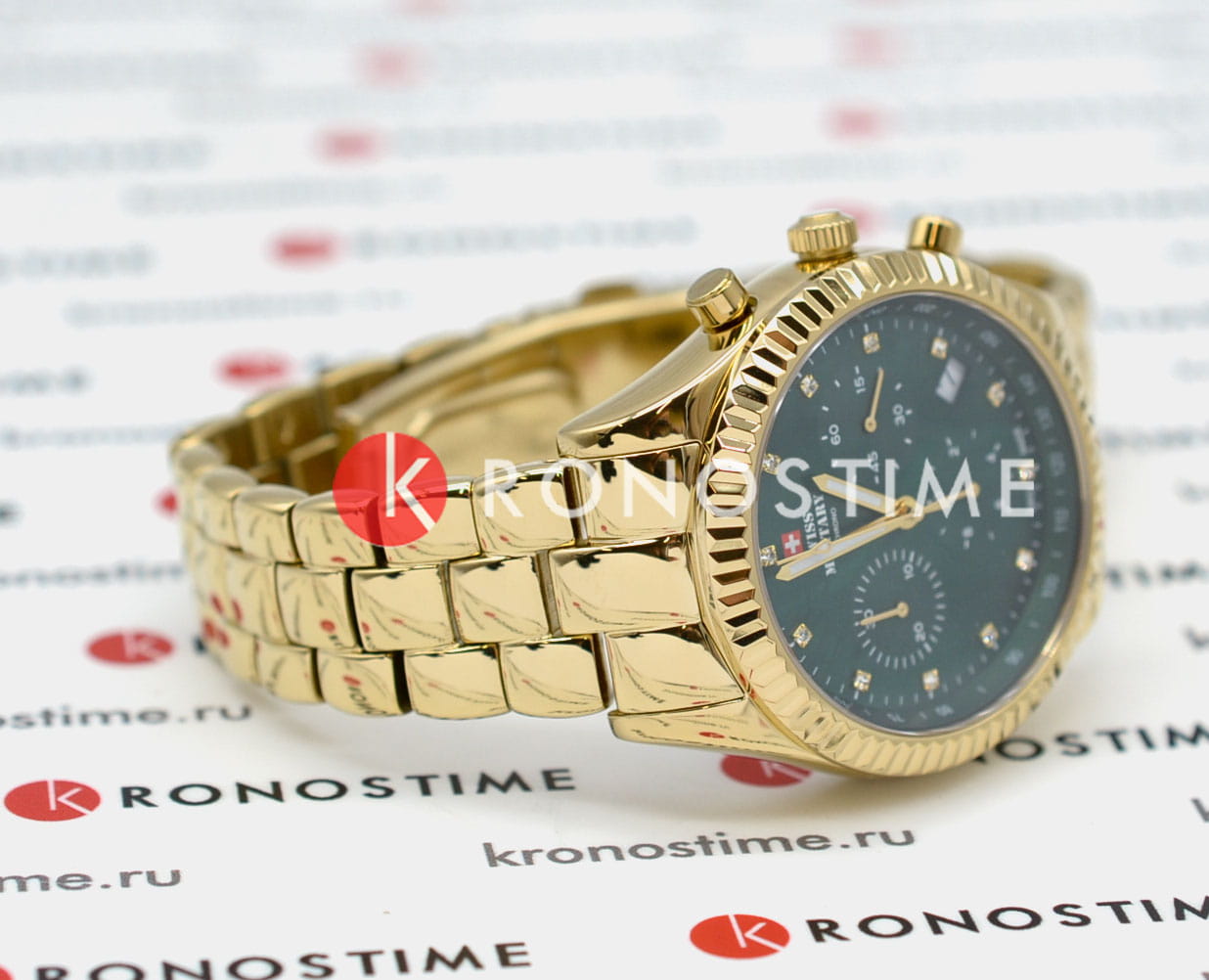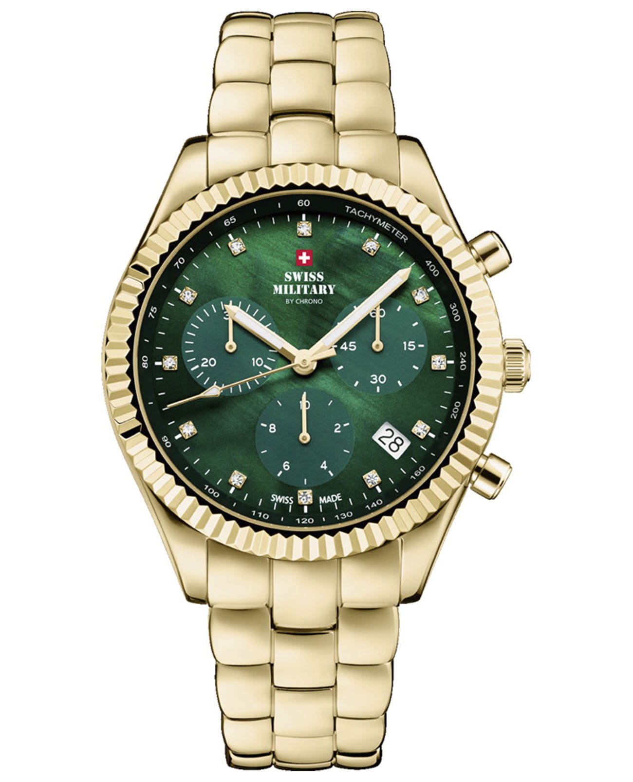 Женские швейцарские часы хронографХронографФункция позволяет измерять отрезки времени с особой точностью: часы, минуты, секунды. Верным признаком хронографа является наличие на циферблате 3 дополнительных окошек-счётчиков. с секундомеромСекундомерСекундоме́р — прибор, способный измерять интервалы времени с точностью до долей секунды. Swiss Military by Chrono Elegant Sports SM30207.04 , кварцевый механизм с высокой точностью. Cапфировое стеклоСапфировое стеклоПрочный и надёжный материал из кристалла сапфира синтетического происхождения, характеризующийся особой твёрдостью и устойчивостью к царапинам и повреждениям. устойчивое к появлению царапин и обладающее высокой прозрачностью. На циферблате расположены три дополнительных индикатора и окошко даты. Метки на циферблате украшены кристаллами. Неподвижный безельБезельВнешний ободок, закрепляющий стекло. В спортивных часах так называется поворотное кольцо с делениями на циферблате, выполняет роль таймера – замеряет отрезки времени на шкале. Неподвижный безель – элемент декора. Однонаправленно вращающийся безель на дайверских часах позволяет фиксировать моменты погружения и выныривания на поверхность. из нержавеющей стали с PVDPVDУльтратонкое покрытие наносится в технике вакуумного напыления, сочетает в себе нитрид титана особой прочности со слоем золота или оксида хрома. Несёт в себе декоративную или защитную функцию. покрытием и со шкалой тахиметрТахиметрРазмеченная шкала, располагается на ободке или безеле часов. Тахиметр позволяет рассчитать скорость на определённом участке пути, расстояние измеряется в километрах или милях.. Стрелки с люминесцентным покрытиемЛюминесцентное покрытиеПозволяет считывать показания времени в темноте. Производители наносят на стрелки, часовые индексы, безель или поверхность циферблата светонакопительный состав, дающий холодное свечение.. Класс водозащиты: 50 метров, позволит защитить корпус от случайных брызг или капель дождя. Корпус и браслет часов изготовлен из нержавеющей стали с PVDPVDУльтратонкое покрытие наносится в технике вакуумного напыления, сочетает в себе нитрид титана особой прочности со слоем золота или оксида хрома. Несёт в себе декоративную или защитную функцию. покрытием. Стальной браслет на раскладной застёжкеРаскладная застёжкаТакой тип застёжки используется только на браслетах из металла. Она никогда не раскрывается полностью, происходит разделение на 2 и более частей. Раскладывающая застёжка снизит вероятность потери часов к минимуму..