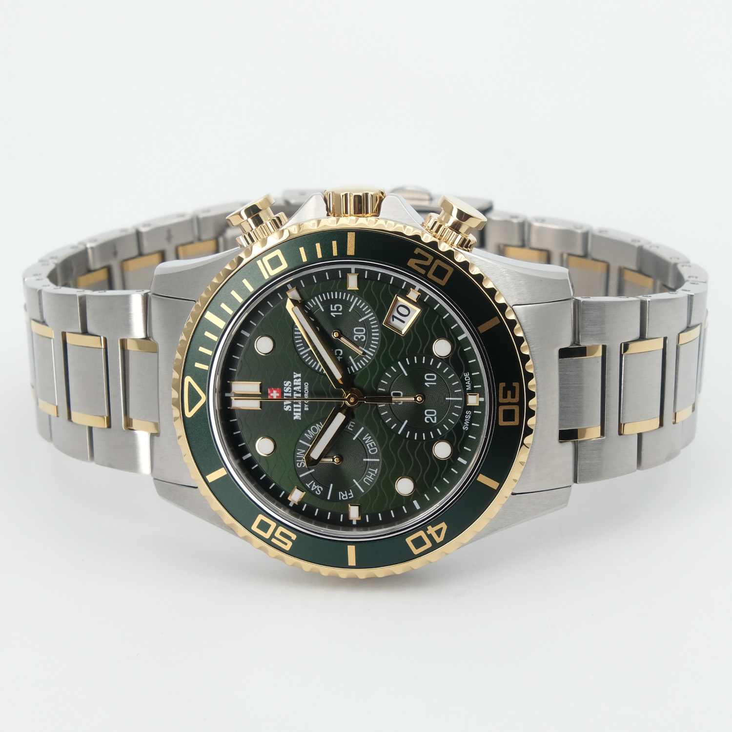 Часы Swiss Military SM34101.05 — это элегантный мужской хронограф, объединяющий швейцарское качество и современный стиль. Корпус диаметром 46 мм выполнен из нержавеющей стали, что обеспечивает долговечность и надёжность. Вращающийся безельБезельВнешний ободок, закрепляющий стекло. В спортивных часах так называется поворотное кольцо с делениями на циферблате, выполняет роль таймера – замеряет отрезки времени на шкале. Неподвижный безель – элемент декора. Однонаправленно вращающийся безель на дайверских часах позволяет фиксировать моменты погружения и выныривания на поверхность. с золотистыми минутными метками и циферблат с крупными золотистыми стрелками создают стильный и запоминающийся облик. Часы оснащены швейцарским кварцевым механизмом Ronda Z60, который обеспечивает точность и надёжность. Функции включают часы, минуты, секунды, дату, день недели и хронограф. Циферблат защищён сапфировым стекломСапфировое стеклоПрочный и надёжный материал из кристалла сапфира синтетического происхождения, характеризующийся особой твёрдостью и устойчивостью к царапинам и повреждениям., устойчивым к царапинам, а люминесцентные стрелки и метки обеспечивают отличную читаемость даже в условиях низкой освещённости. Браслет из нержавеющей стали с раскладной застёжкойРаскладная застёжкаТакой тип застёжки используется только на браслетах из металла. Она никогда не раскрывается полностью, происходит разделение на 2 и более частей. Раскладывающая застёжка снизит вероятность потери часов к минимуму. обеспечивает комфортное ношение и надёжную фиксацию. Водозащита до 10 ATM делает модель подходящей для плавания и других водных активностей. Swiss Military — это аксессуар, который подчеркнёт стиль и статус современного мужчины, ценящего элегантность и практичность.