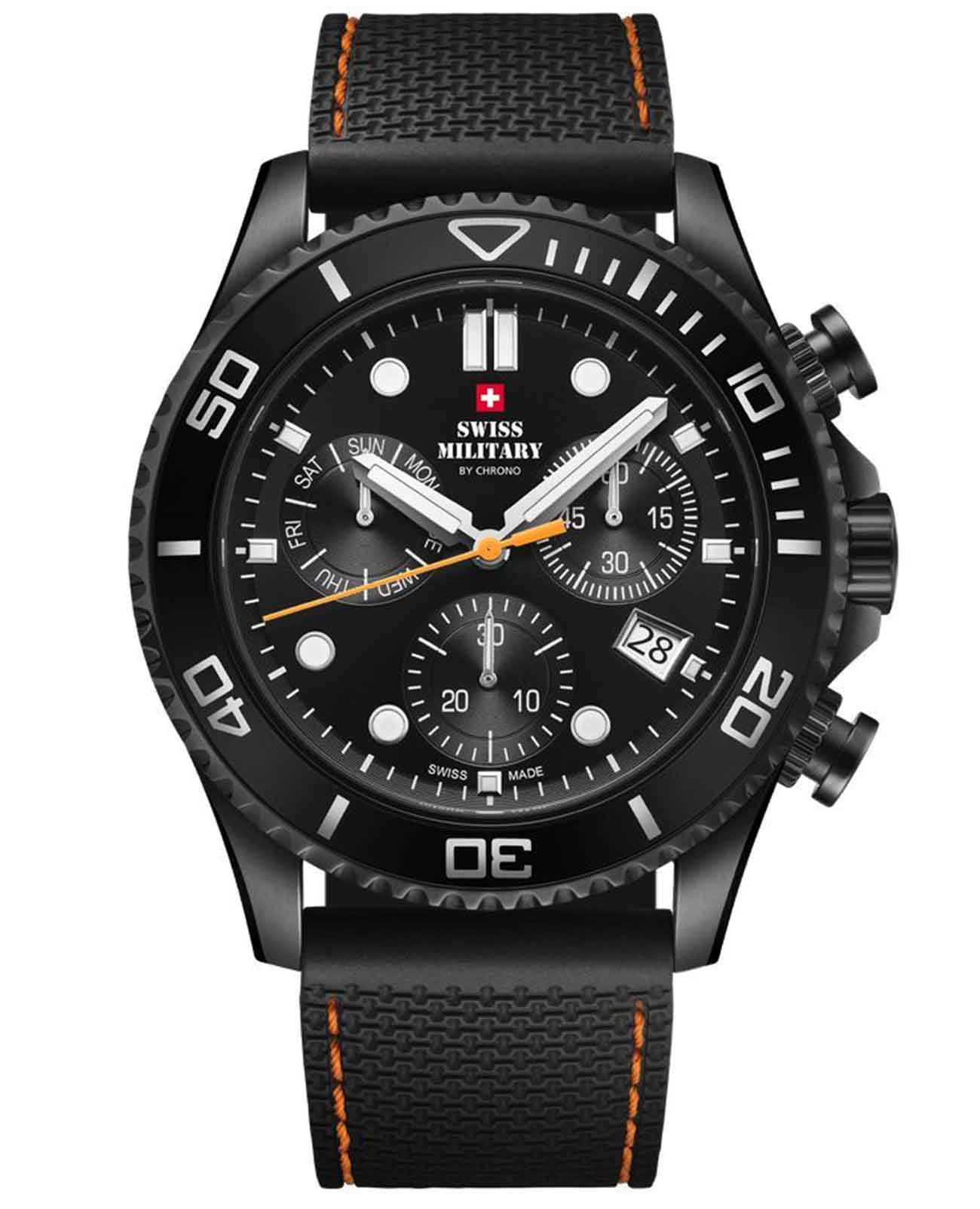 Часы Swiss Military SM34101.08 — это стильный мужской хронограф, который сочетает швейцарское качество и функциональность. Корпус диаметром 46 мм выполнен из нержавеющей стали с чёрным PVD-покрытиемPVDУльтратонкое покрытие наносится в технике вакуумного напыления, сочетает в себе нитрид титана особой прочности со слоем золота или оксида хрома. Несёт в себе декоративную или защитную функцию., что придаёт часам современный и прочный вид. Чёрный циферблат с люминесцентными стрелкамиЛюминесцентное покрытиеПозволяет считывать показания времени в темноте. Производители наносят на стрелки, часовые индексы, безель или поверхность циферблата светонакопительный состав, дающий холодное свечение. и метками обеспечивает превосходную читаемость даже в условиях низкой освещённости. Циферблат защищён сапфировым стекломСапфировое стеклоПрочный и надёжный материал из кристалла сапфира синтетического происхождения, характеризующийся особой твёрдостью и устойчивостью к царапинам и повреждениям., устойчивым к царапинам. Модель оснащена швейцарским кварцевым механизмом, обеспечивающим точное измерение времени. Хронограф позволяет отображать часы, минуты, секунды, а также дату, что добавляет удобства в повседневной жизни. Ремень из высококачественного каучука с оранжевой прострочкой и классической застёжкой обеспечивает комфортное ношение и надёжную фиксацию. Водозащита до 10 ATM делает часы подходящими для плавания и других водных активностей. Swiss Military — это идеальный выбор для мужчин, ценящих стиль, надёжность и функциональность.