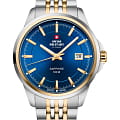 Часы Swiss Military SM34104.05 — это элегантный мужской аксессуар, сочетающий швейцарское качество и классический дизайн. Корпус диаметром 40 мм и браслет выполнены из нержавеющей стали и БезельБезельВнешний ободок, закрепляющий стекло. В спортивных часах так называется поворотное кольцо с делениями на циферблате, выполняет роль таймера – замеряет отрезки времени на шкале. Неподвижный безель – элемент декора. Однонаправленно вращающийся безель на дайверских часах позволяет фиксировать моменты погружения и выныривания на поверхность. с PVD-покрытиемPVDУльтратонкое покрытие наносится в технике вакуумного напыления, сочетает в себе нитрид титана особой прочности со слоем золота или оксида хрома. Несёт в себе декоративную или защитную функцию., придающим изделию изысканный двухцветный вид. Синий циферблат с солнечным узором украшен золотистыми часовыми метками и стрелками, защищёнными прочным сапфировым стекломСапфировое стеклоПрочный и надёжный материал из кристалла сапфира синтетического происхождения, характеризующийся особой твёрдостью и устойчивостью к царапинам и повреждениям., устойчивым к царапинам.
