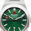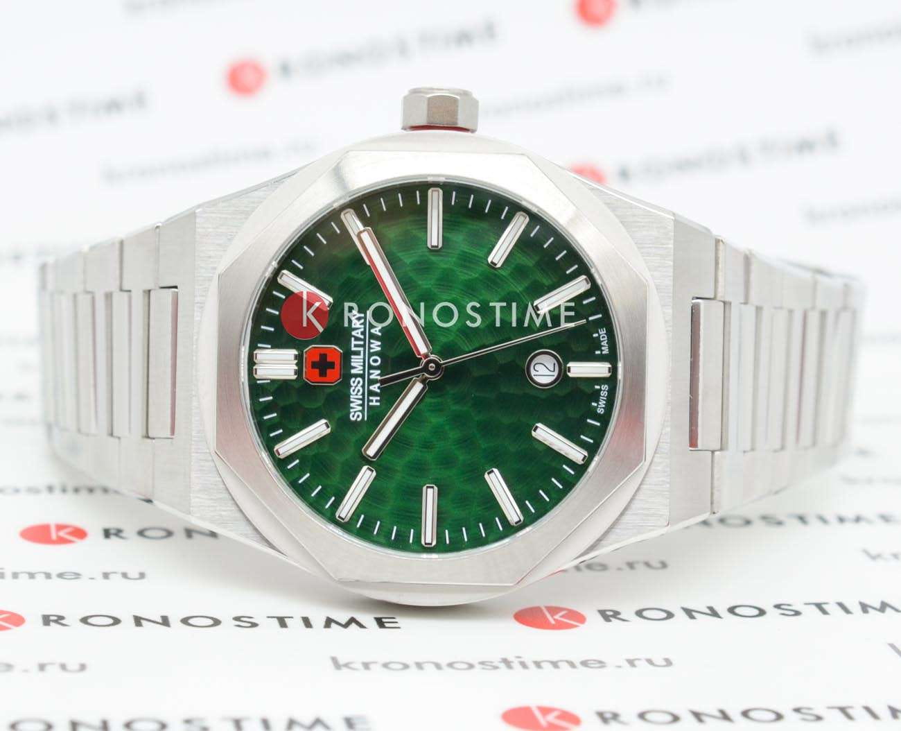 Мужские наручные часы Swiss Military Hanowa Octon Hammered SMWGH2101906r сочетают в себе стильный дизайн и высокую функциональность. Модель обладает круглым корпусом диаметром 43 мм, выполненным из нержавеющей стали, что обеспечивает прочность, устойчивость к коррозии и долговечность . Браслет также изготовлен из нержавеющей стали с раскладной застежкойРаскладная застёжкаТакой тип застёжки используется только на браслетах из металла. Она никогда не раскрывается полностью, происходит разделение на 2 и более частей. Раскладывающая застёжка снизит вероятность потери часов к минимуму., гарантирующей комфортное ношение и безопасность. Зеленый циферблат оснащен метками в виде штрихов и окном даты в положении «6 часа» . Для защиты используется сапфировое стеклоСапфировое стеклоПрочный и надёжный материал из кристалла сапфира синтетического происхождения, характеризующийся особой твёрдостью и устойчивостью к царапинам и повреждениям., которое обеспечивает превосходную защиту от царапин и антибликовый эффект. Часы работают на кварцевом механизме швейцарского производства, что гарантирует высокую точность хода без необходимости подзаводки. Модель отличается водонепроницаемостью до 100 метров (10 атмосфер), что позволяет использовать их во время плавания и других водных видов спорта. Элегантный дизайн и надежность делают эти часы идеальным выбором для повседневного использования и активного образа жизни.