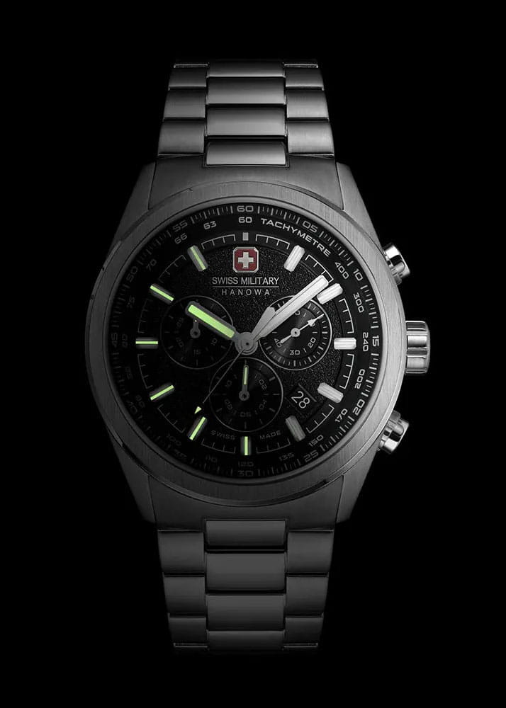 Мужские швейцарские часы Swiss Military Hanowa SMWGI0004204 – это элегантные часы, сочетающие в себе классический дизайн и современную функциональность. Корпус из нержавеющей стали диаметром 43 мм сбалансирован и элегантен. Сапфировое стеклоСапфировое стеклоПрочный и надёжный материал из кристалла сапфира синтетического происхождения, характеризующийся особой твёрдостью и устойчивостью к царапинам и повреждениям. с антибликовым покрытием защищает циферблат от царапин и обеспечивает отличную читаемость при любом освещении. Браслет с раскладной застёжкойРаскладная застёжкаТакой тип застёжки используется только на браслетах из металла. Она никогда не раскрывается полностью, происходит разделение на 2 и более частей. Раскладывающая застёжка снизит вероятность потери часов к минимуму. идеально дополняют дизайн часов, обеспечивая комфортное ношение. Люминесцентное покрытиеЛюминесцентное покрытиеПозволяет считывать показания времени в темноте. Производители наносят на стрелки, часовые индексы, безель или поверхность циферблата светонакопительный состав, дающий холодное свечение. стрелок и меток позволит вам следить за временем даже в полной темноте. Циферблат с точным механизмом хронографаХронографФункция позволяет измерять отрезки времени с особой точностью: часы, минуты, секунды. Верным признаком хронографа является наличие на циферблате 3 дополнительных окошек-счётчиков. и хорошо заметным индикатором даты в положении между 4 и 5 часов. ТахиметрТахиметрРазмеченная шкала, располагается на ободке или безеле часов. Тахиметр позволяет рассчитать скорость на определённом участке пути, расстояние измеряется в километрах или милях. по внешнему краю. Водонепроницаемость до 100 метров хорошо подходят для повседневного ношения и занятий водными видами спорта.