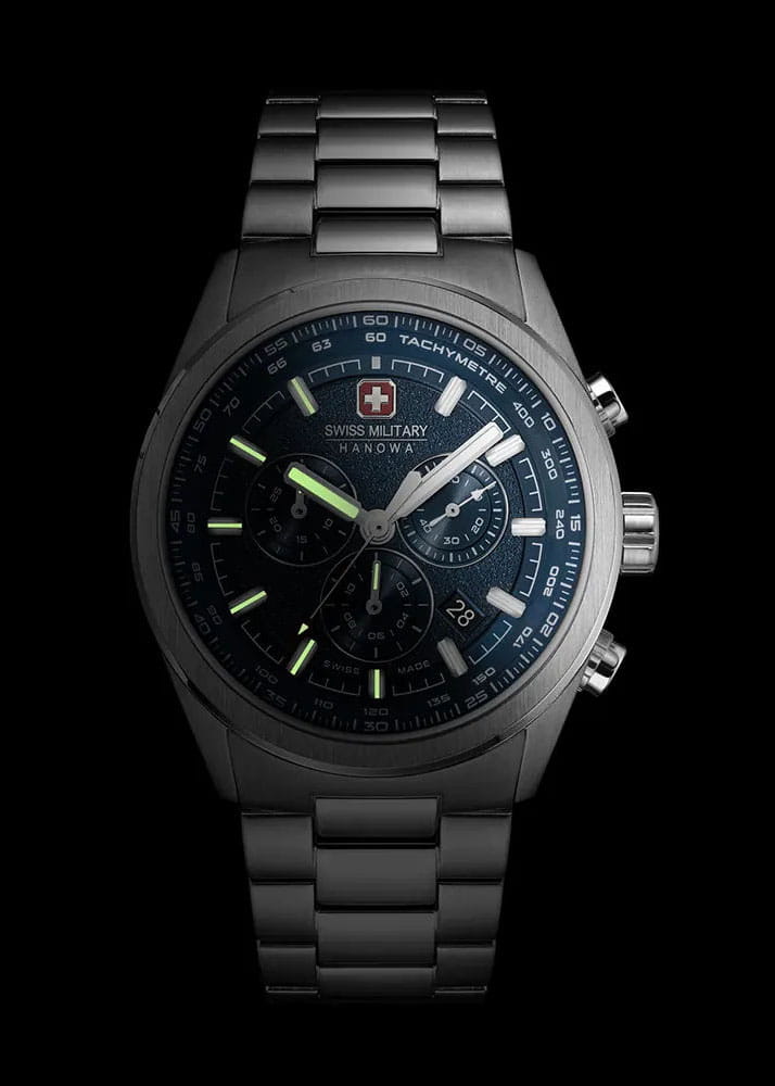 Мужские швейцарские часы Swiss Military Hanowa SMWGI0004205 – это элегантные часы, сочетающие в себе классический дизайн и современную функциональность. Корпус из нержавеющей стали диаметром 43 мм сбалансирован и элегантен. Сапфировое стеклоСапфировое стеклоПрочный и надёжный материал из кристалла сапфира синтетического происхождения, характеризующийся особой твёрдостью и устойчивостью к царапинам и повреждениям. с антибликовым покрытием защищает циферблат от царапин и обеспечивает отличную читаемость при любом освещении. Браслет с раскладной застёжкойРаскладная застёжкаТакой тип застёжки используется только на браслетах из металла. Она никогда не раскрывается полностью, происходит разделение на 2 и более частей. Раскладывающая застёжка снизит вероятность потери часов к минимуму. идеально дополняют дизайн часов, обеспечивая комфортное ношение. Люминесцентное покрытиеЛюминесцентное покрытиеПозволяет считывать показания времени в темноте. Производители наносят на стрелки, часовые индексы, безель или поверхность циферблата светонакопительный состав, дающий холодное свечение. стрелок и меток позволит вам следить за временем даже в полной темноте. Циферблат с точным механизмом хронографаХронографФункция позволяет измерять отрезки времени с особой точностью: часы, минуты, секунды. Верным признаком хронографа является наличие на циферблате 3 дополнительных окошек-счётчиков. и хорошо заметным индикатором даты в положении между 4 и 5 часов. ТахиметрТахиметрРазмеченная шкала, располагается на ободке или безеле часов. Тахиметр позволяет рассчитать скорость на определённом участке пути, расстояние измеряется в километрах или милях. по внешнему краю. Водонепроницаемость до 100 метров хорошо подходят для повседневного ношения и занятий водными видами спорта.