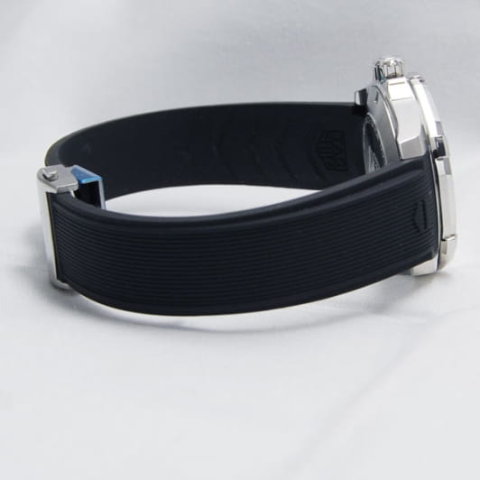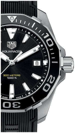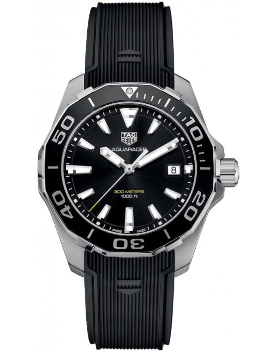 TAG Heuer Aquaracer WAY111A.FT6151 — элегантные мужские часы, сочетающие современный дизайн и высокую функциональность. Корпус диаметром 41 мм выполнен из стали и безельБезельВнешний ободок, закрепляющий стекло. В спортивных часах так называется поворотное кольцо с делениями на циферблате, выполняет роль таймера – замеряет отрезки времени на шкале. Неподвижный безель – элемент декора. Однонаправленно вращающийся безель на дайверских часах позволяет фиксировать моменты погружения и выныривания на поверхность. из стали с аллюминием с PVD-покрытиемPVDУльтратонкое покрытие наносится в технике вакуумного напыления, сочетает в себе нитрид титана особой прочности со слоем золота или оксида хрома. Несёт в себе декоративную или защитную функцию., обеспечивающим лёгкость и прочность. Циферблат с часовыми метками и стрелками, покрытыми люминесцентным покрытиемЛюминесцентное покрытиеПозволяет считывать показания времени в темноте. Производители наносят на стрелки, часовые индексы, безель или поверхность циферблата светонакопительный состав, дающий холодное свечение., гарантирует отличную читаемость в любых условиях освещения. Часы оснащены точным кварцевым механизмом, обеспечивающим стабильное отображение времени. Функциональность включает индикацию часов, минут, секунд и даты, расположенной на отметке «3 часа». Сапфировое стеклоСапфировое стеклоПрочный и надёжный материал из кристалла сапфира синтетического происхождения, характеризующийся особой твёрдостью и устойчивостью к царапинам и повреждениям. обеспечивает надёжную защиту от царапин и превосходную читаемость. Чёрный каучуковый ремешок оснащён стандартной застежкой. Водозащита до 300 метров (30 бар) делает модель идеальной для дайвинга и активного образа жизни.