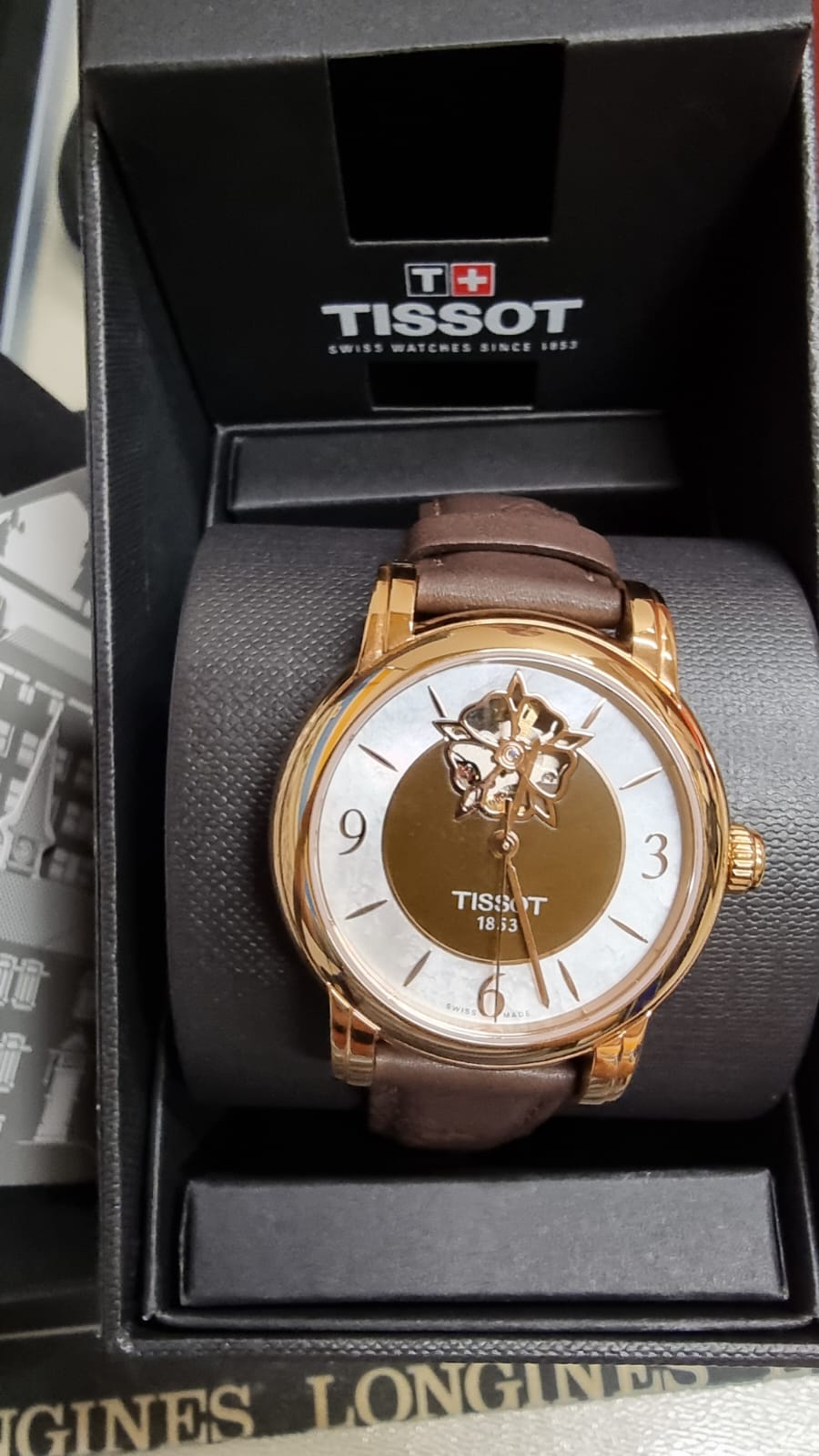 Эксклюзивный дизайн (окошко в виде цветка, через который виден механизм). Запас хода до 80 часов. Перламутровый циферблат.