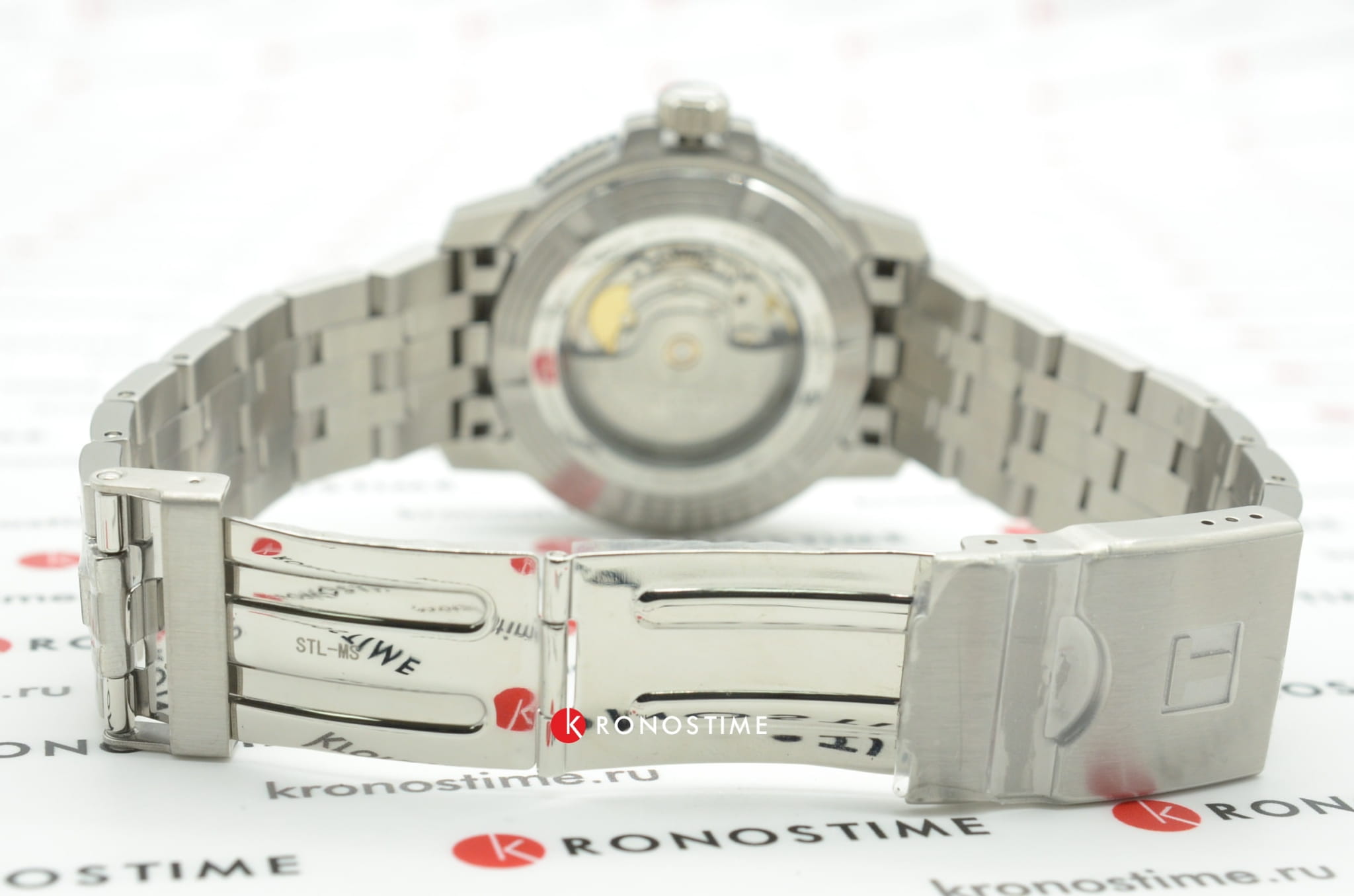 Аксессуар характеризуется как дайверские часы, водонепроницаемость сохраняется при давлении до 30 бар на глубине 300 метров. Модель имеет сине-серебристое исполнение, такое сочетание гармонирует с любой одеждой. Внутри герметичного корпуса с завинчивающейся заводной головкой находится популярный швейцарский калибр Powermatic 80Powermatic 80Эксклюзивный калибр от швейцарской компании ETA с увеличенным запасом хода до 80 часов за счёт удлинённой заводной пружины. Характеризуется улучшенной системой спуска со сниженным трением. с запасом хода до 80 часов. Прозрачная задняя крышка. Керамический безельБезельВнешний ободок, закрепляющий стекло. В спортивных часах так называется поворотное кольцо с делениями на циферблате, выполняет роль таймера – замеряет отрезки времени на шкале. Неподвижный безель – элемент декора. Однонаправленно вращающийся безель на дайверских часах позволяет фиксировать моменты погружения и выныривания на поверхность.. Надежный стальной браслет с застёжкой с удлинением для дайверовУдлинение для дайверовЗастёжка с удлинением для дайверов представляет собой безопасное крепление, которое позволяет надевать часы поверх гидрокостюма. Гибкая застёжка удлиняется на 1-2 миллиметра.. Люминесцентная подсветкаЛюминесцентное покрытиеПозволяет считывать показания времени в темноте. Производители наносят на стрелки, часовые индексы, безель или поверхность циферблата светонакопительный состав, дающий холодное свечение.. Окошко даты. Габариты: 43 x 43 x 12,7 мм.