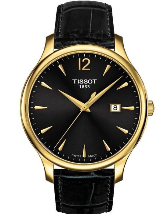 TISSOT T063.610.36.057.00 T-Classic Tradition - женские кварцевые наручные часы. Корпус этих часов среднего размера (42 мм) и выполнен из нержавеющей стали L316 с PVD-покрытием цвета желтого золота. Модель TISSOT T063.610.36.057.00 T-Classic Tradition имеет устойчивое к царапинам сапфировое стекло, ремешок из натуральной кожи черного цвета, черный циферблат. Калибр механизма: ETA F06.111. Класс водозащиты: 30 м / 3 АТМ (защита от брызг и случайных капель).
