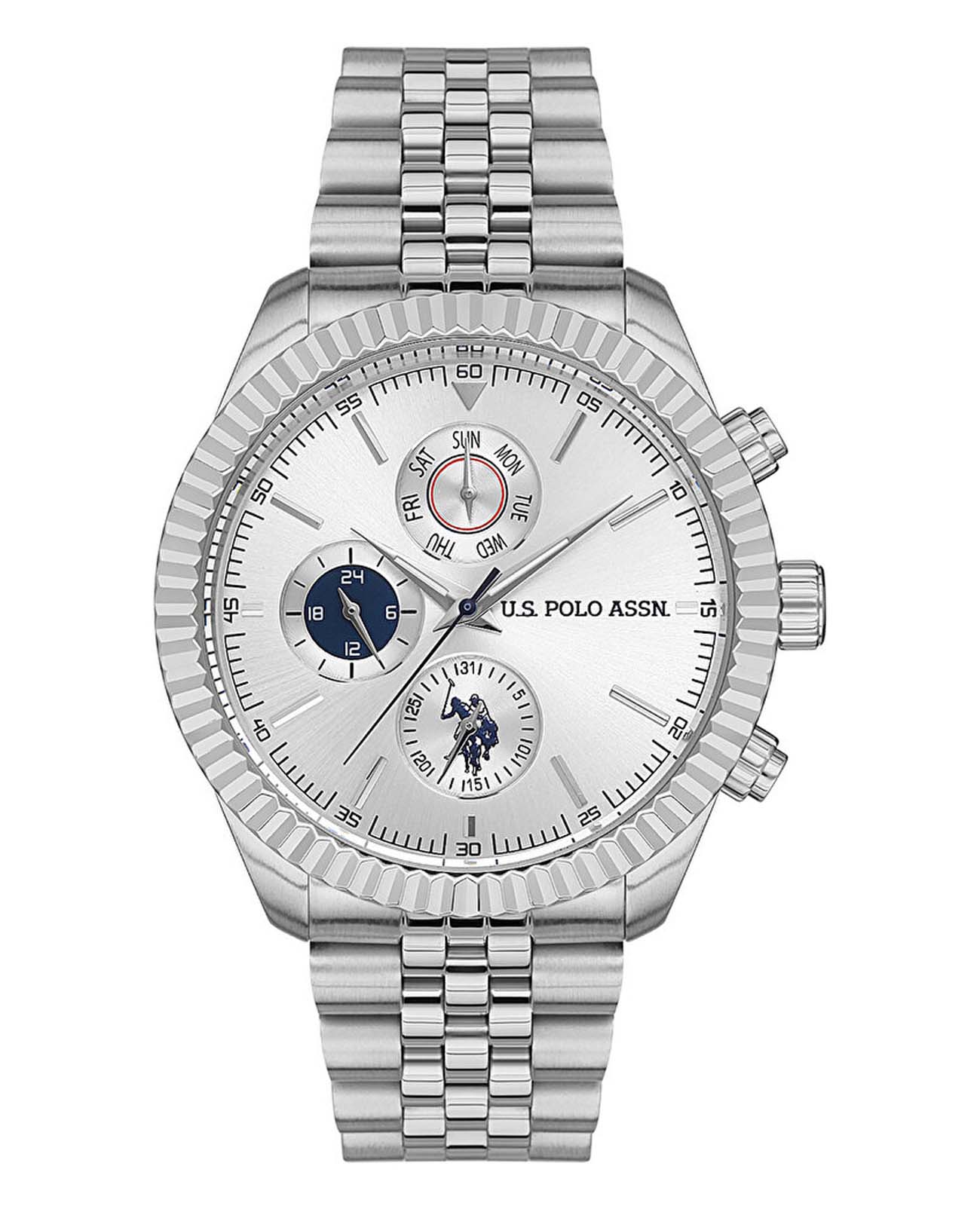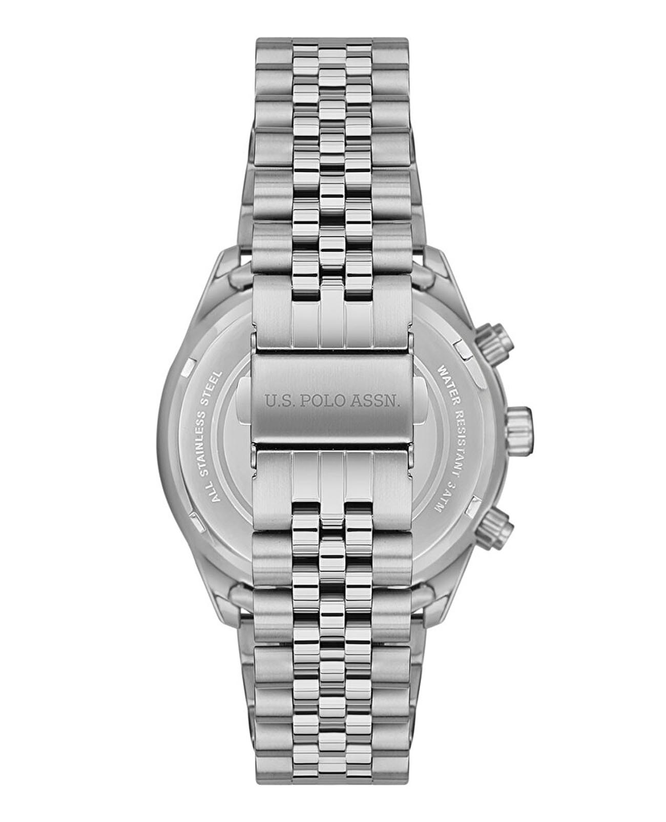Мужские часы U.S. Polo Assn. Crossing USPA1054-01, кварцевый механизм с высокой точностью. Минеральное стеклоМинеральное стеклоМинеральное стекло представляет собой искусственно выращенный минерал кварца. Такое стекло отличается особой устойчивостью к повреждениям и царапинам. Уступает по некоторым качествам сапфировому стеклу. устойчивое к появлению царапин, обладающее высокой прозрачностью. Корпус изготовлен из нержавеющей стали. Центральные часовая, минутная и секундная стрелки. Индикация даты и дня недели. 12/24х часовой формат времени. Стрелки с люминесцентным покрытиемЛюминесцентное покрытиеПозволяет считывать показания времени в темноте. Производители наносят на стрелки, часовые индексы, безель или поверхность циферблата светонакопительный состав, дающий холодное свечение.. Класс водозащиты: 50 метров, позволит защитить корпус от случайных брызг или капель дождя. Стальной браслет на раскладной застёжкеРаскладная застёжкаТакой тип застёжки используется только на браслетах из металла. Она никогда не раскрывается полностью, происходит разделение на 2 и более частей. Раскладывающая застёжка снизит вероятность потери часов к минимуму..