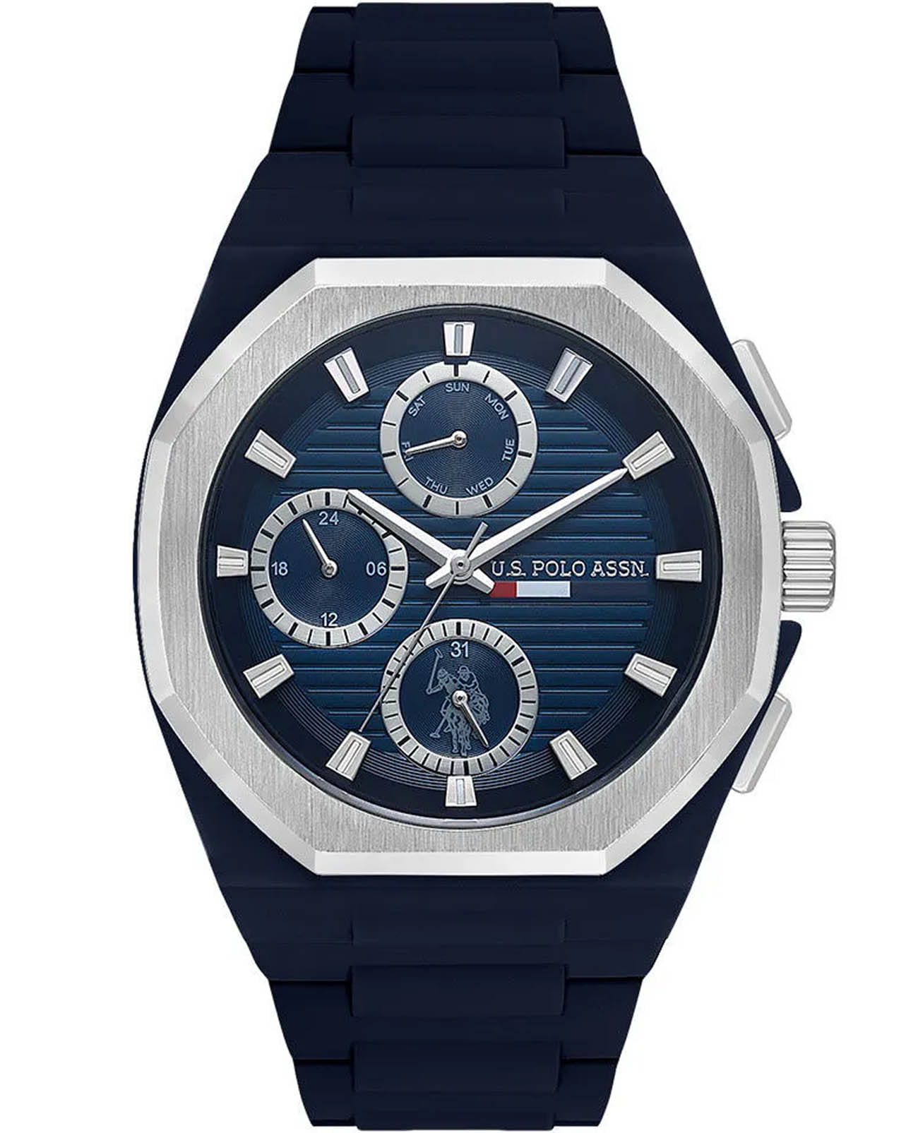 Мужские элегантные американские часы U.S. Polo Assn. Crossing USPA1103-01 обладают кварцевым механизмом с высокой точностью. Минеральное стеклоМинеральное стеклоМинеральное стекло представляет собой искусственно выращенный минерал кварца. Такое стекло отличается особой устойчивостью к повреждениям и царапинам. Уступает по некоторым качествам сапфировому стеклу. устойчивое к появлению царапин, обладающее высокой прозрачностью. Изысканный корпус изготовлен из нержавеющей стали. Лаконичные серебристые центральные часовая, минутная и секундная стрелки. 24-х часовой формат времени, дата и день недели вынесены на отдельный циферблат. Класс водозащиты: 30 метров, позволит защитить корпус от случайных брызг или капель дождя. Силиконовый ремень со стандартной застежкой обеспечивает комфорт и удобство в использовании, добавляя завершающий штрих к этому стильному и высокоэффективному аксессуару. Это практичный и стильный инструмент для активной повседневности, объединяющий точный механизм и удобство.